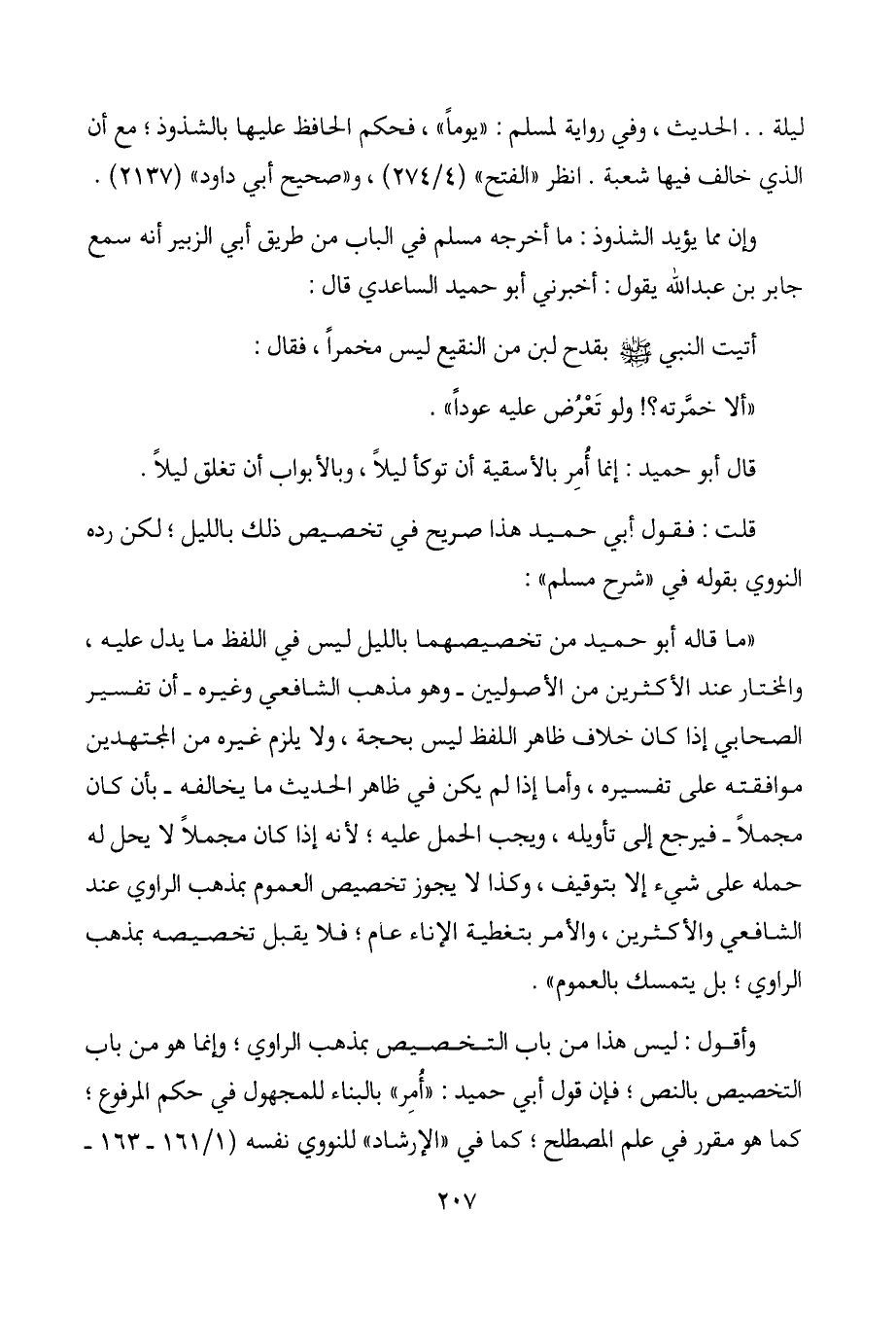 "ما قاله أبو حميد من تخصيصهما بالليل ليس في اللفظ ما يدل عليه، والمختار عند الأكثرين من الأصوليين- وهو مذهب الشافعي وغيره- أن تفسير الصحابي إذا كان خلاف ظاهر اللفظ ليس بحجة، ولا يلزم غيره من المجتهدين موافقته على تفسيره، وأما إذا لم يكن في ظاهر الحديث ما يخالفه- بأن كان مجملاً- فيرجع إلى تأويله، ويجب الحمل عليه؛ لأنه إذا كان مجملاً لا يحل له حمله على شيء إلا بتوقيف، وكذا لا يجوز تخصيص العموم بمذهب الراوي عند الشافعي والأكثرين، والأمر بتغطية الإناء عام؛ فلا يقبل تخصيصه بمذهب الراوي؛ بل يتمسك بالعموم ".