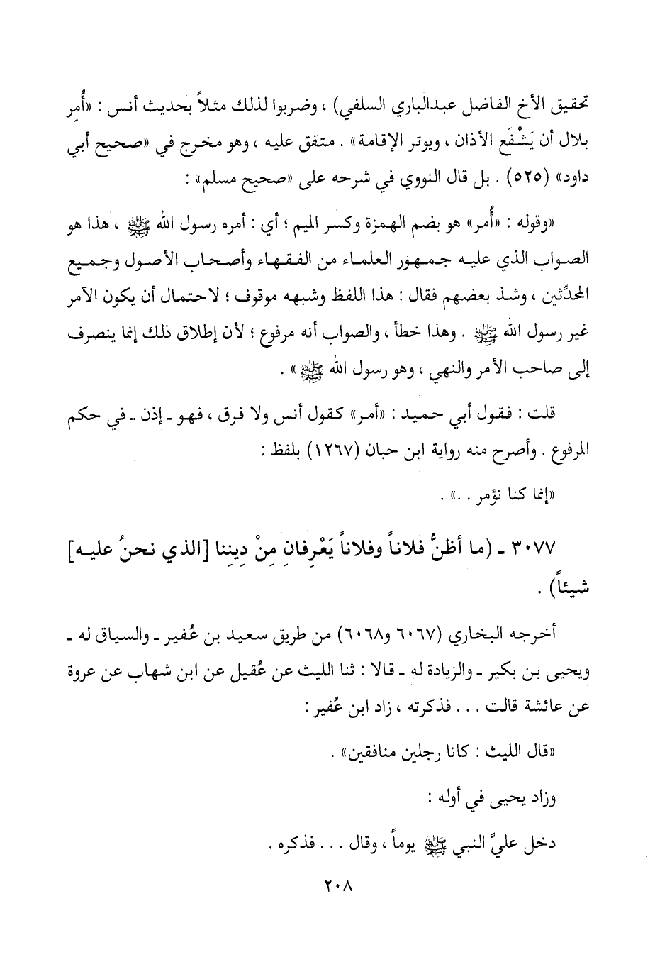 تحقيق الأخ الفاضل عبد الباري السلفي) ، وضربوا لذلك مثلاً بحديث أنس: "أمر بلال أن يشفع الأذان، ويوتر الإقامة". متفق عليه، وهو مخرج في "صحيح أبي داود" (525) . بل قال النووي في شرحه على "صحيح مسلم ":