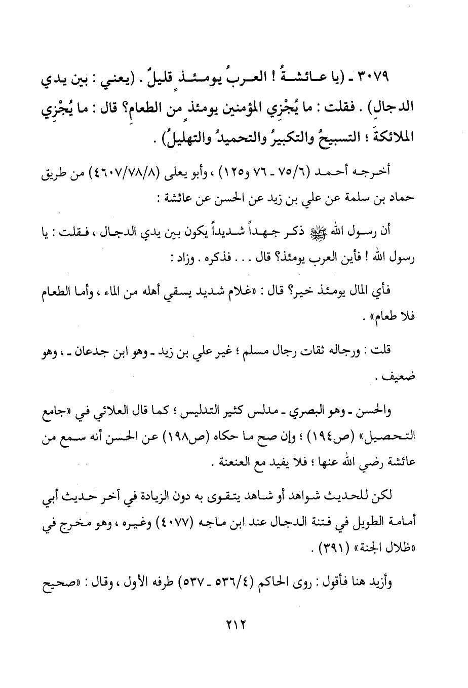 3079- (يا عائشةُ! العربُ يومئذٍ قليلٌ. (يعني: بين يدي الدجال) . فقلت: ما يُجْزِي المؤمنين يومئذٍ من الطعامِ؟ قال: ما يُجْزِي الملائكة؛ التسبيحُ والتكبيرُ والتحميدُ والتهليلُ) .