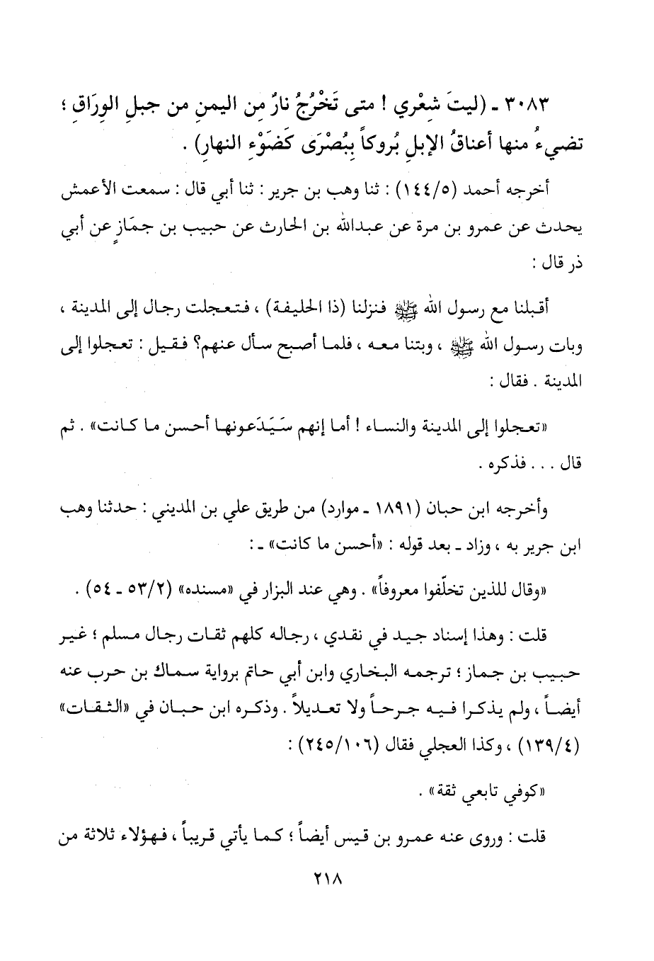 3083- (ليتَ شِعْري! متى تَخْرُجُ نارٌ من اليمن من جبل الوِرَاقِ؛ تضيء منها أعناقُ الإبل بُروكاً بِبُصرى كضَوْءِ النهارِ) .