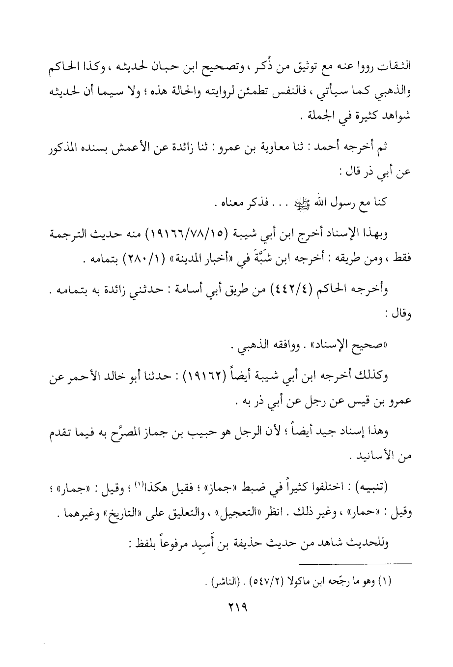 (تنبيه) : اختلفوا كثيراً في ضبط "جماز"؛ فقيل هكذا (¬1) ؛ وقيل: "جمار"؛ وقيل: " حمار"، وغير ذلك انظر " التعجيل "، والتعليق على " التاريخ " وغيرهما. وللحديث شاهد من حديث حذيفة بن أسيد مرفوعاً بلفظ:
