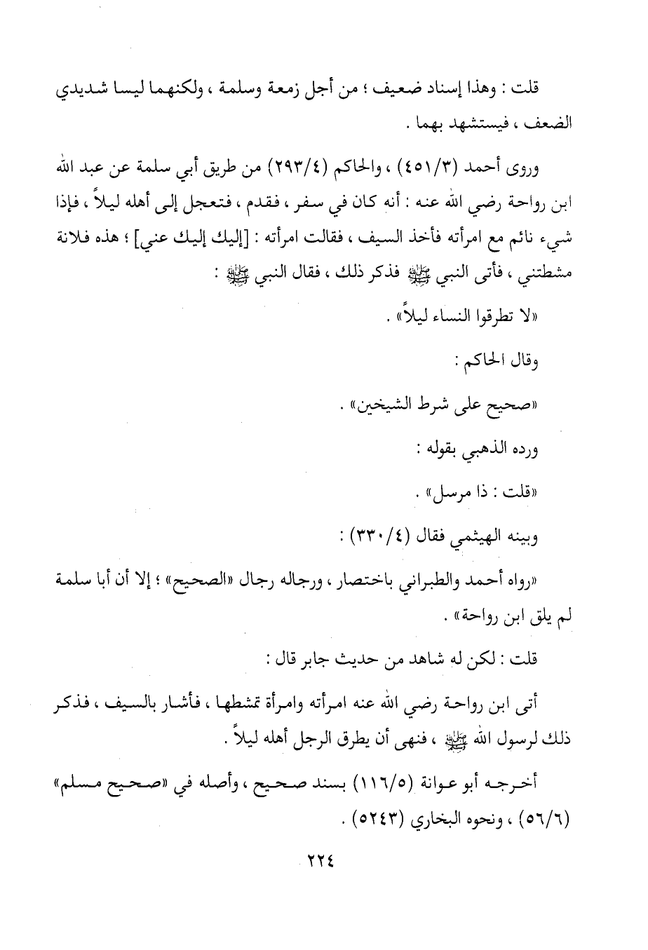 وروى أحمد (3/ 451) ، والحاكم (4/293) من طريق أبي سلمة عن عبد الله ابن رواحة رضي الله عنه. أنه كان في سفر، فقدم، فتعجل إلى أهله ليلاً، فإذا شيء نائم مع امرأته فأخذ السيف، فقالت امرأته: [إليك إليك عني] ؛ هذه فلانة مشطتني، فأتى النبي - صلى الله عليه وسلم - فذكر ذلك، فقال النبي - صلى الله عليه وسلم -: