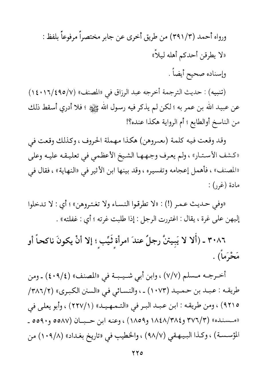 3086- (ألا لا يَبِيتنَّ رجلُ عند امرأةٍ ثيبٍ؛ إلا أنْ يكون ناكحاً أو مَحْرَماً) .