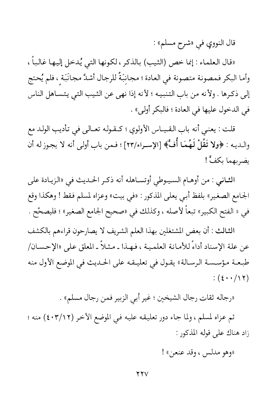قلت: يعني أنه باب القياس الأولوي؛ كقوله تعالى في تأديب الولد مع والديه: (ولا تقل لهما أف) [الإسراء/23] ؛ فمن باب أولى أنه لا يجوز له أن يضربهما بكف!