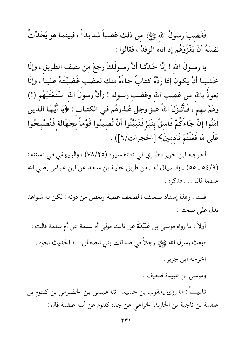 يا رسول الله! إنا حُدِّثنا أن رسولك رجع من نصف الطريق، وإنّا خشينا أن يكون إنما رّدَّهُ كتابٌ جاءه منك لغضبٍ غَضِبتَهُ علينا، وإنا نعوذ بالله من غضب الله وغضب رسوله! وأن رسول الله اسْتَعْتَبَهُم (!) وهَمَّ بهم، فأنزل الله عز وجل عُذرَهُم في الكتاب: (يا أيها الذين آمنوا إن جاءكم فاسق بنبإ فتبينوا أن تصيبوا قوماً بجهالة فتصبحوا على ما فعلتم نادمين) [الحجرات/6]