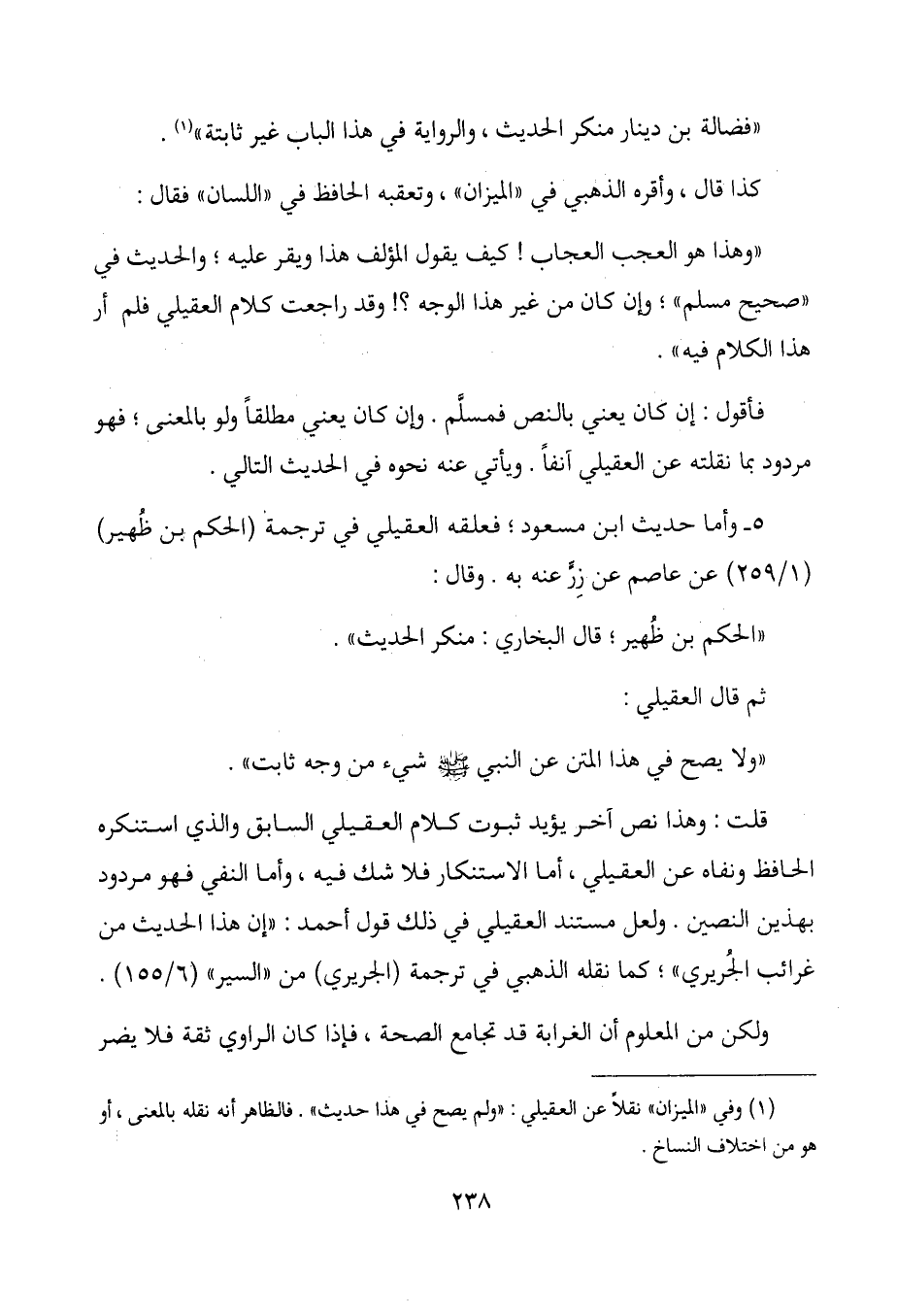 "وهذا هو العجب العجاب! كيف يقول المؤلف هذا ويقر عليه؛ والحديث في "صحيح مسلم "، وإن كان من غير هذا الوجه؟! وقد راجعت كلام العقيلي فلم أر هذا الكلام فيه ".