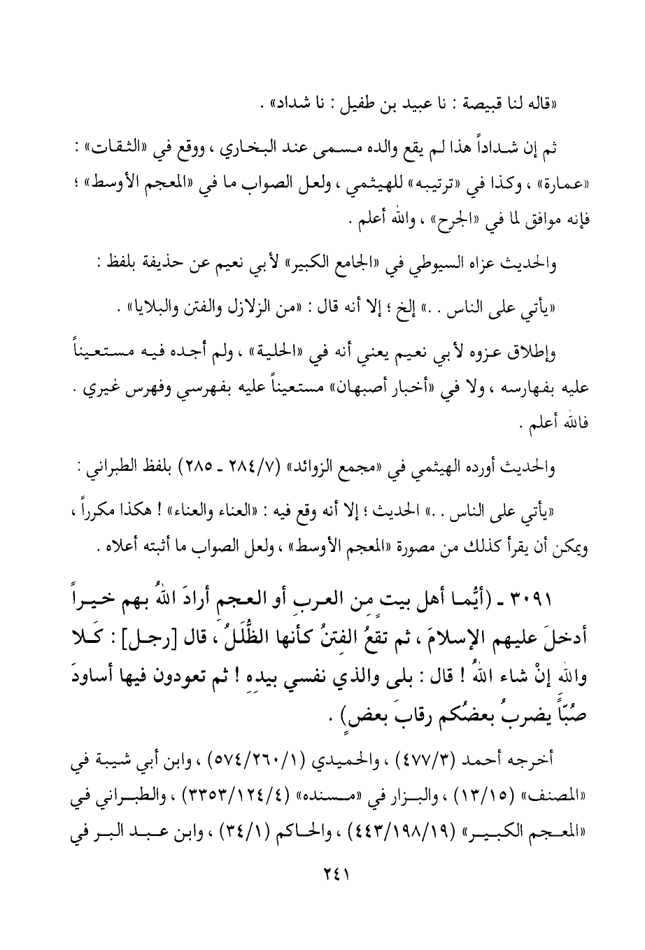 3091- (أيُّما أهل بيتٍ من العرب أو العجم أراد اللهُ بهم خيراً أدخل عليهم الإسلام، ثم تقع الفتن كأنها الظُّلَُ، قال [رجل] : كلا والله إن شاء الله! قال: بلى والذي نفسي بيده! ثم تعودون فيها أساود صُبَاًَ يضرب بعضكم رقاب بعض) .