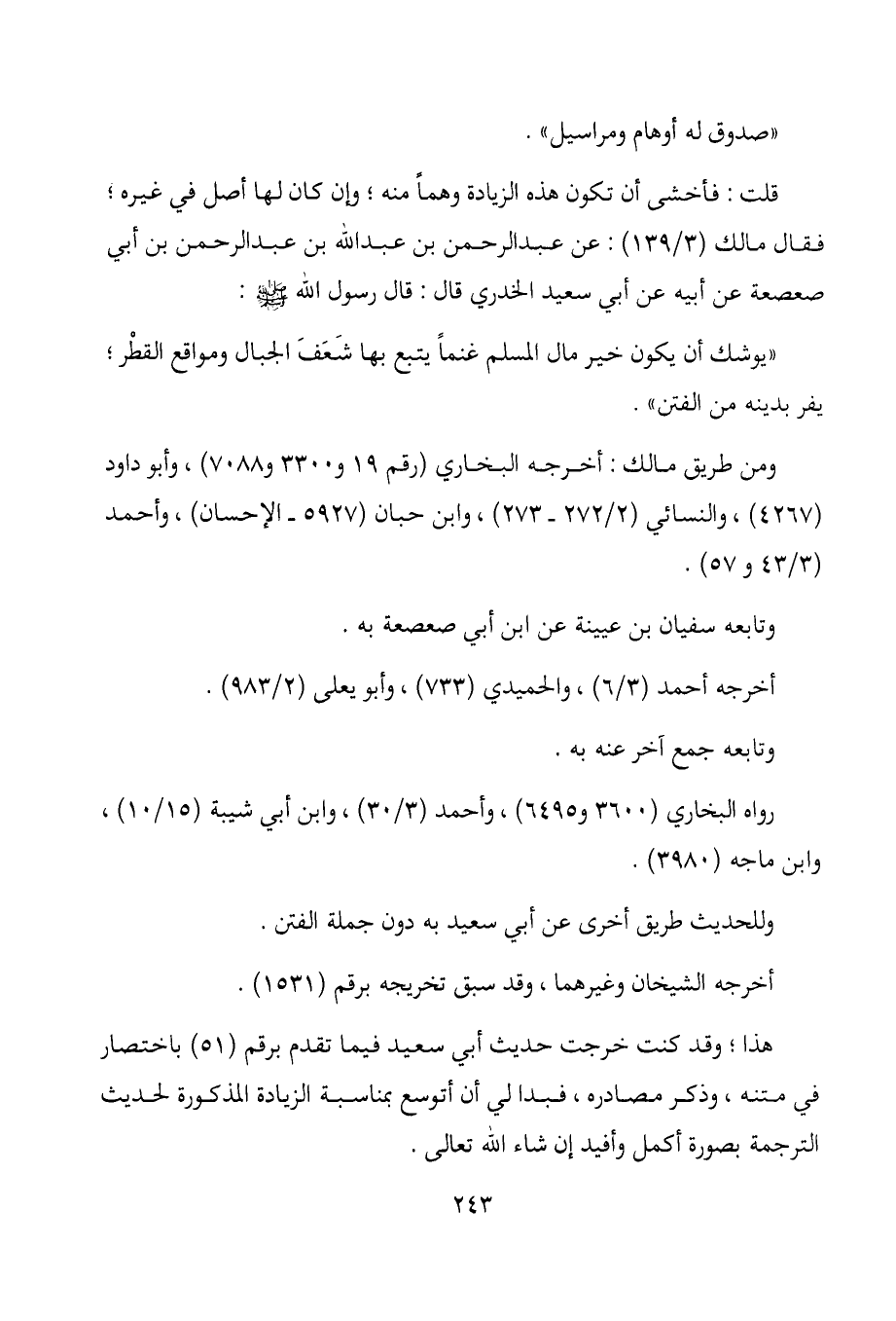 قلت: فأخشى أن تكون هذه الزيادة وهماً منه؛ وإن كان لها أصل في غيره؛ فقال مالك (3/139) : عن عبد الرحمن بن عبد الله بن عبد الرحمن بن أبي صعصعة عن أبيه عن أبي سعيد الخدري قال: قال رسول الله - صلى الله عليه وسلم -: