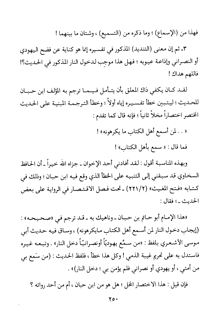 "هذا الإمام أبو حاتم بن حبان- وناهيك به- قد ترجم في "صحيحه ": (إيجاب دخول النار لمن أسمع أهل الكتاب مايكرهونه) ، وساق فيه حديث أبي موسى الأشعري بلفظ: "من سمع يهودياً أونصرانياً دخل النار". وتبعه غيره فاستدل به على تحريم غيبة الذمي! وكل هذا خطأ، فلفظ الحديث: (من سمع بي من أمتي، أو يهودي أو نصراني فلم يؤمن بي؛ دخل النار) ".