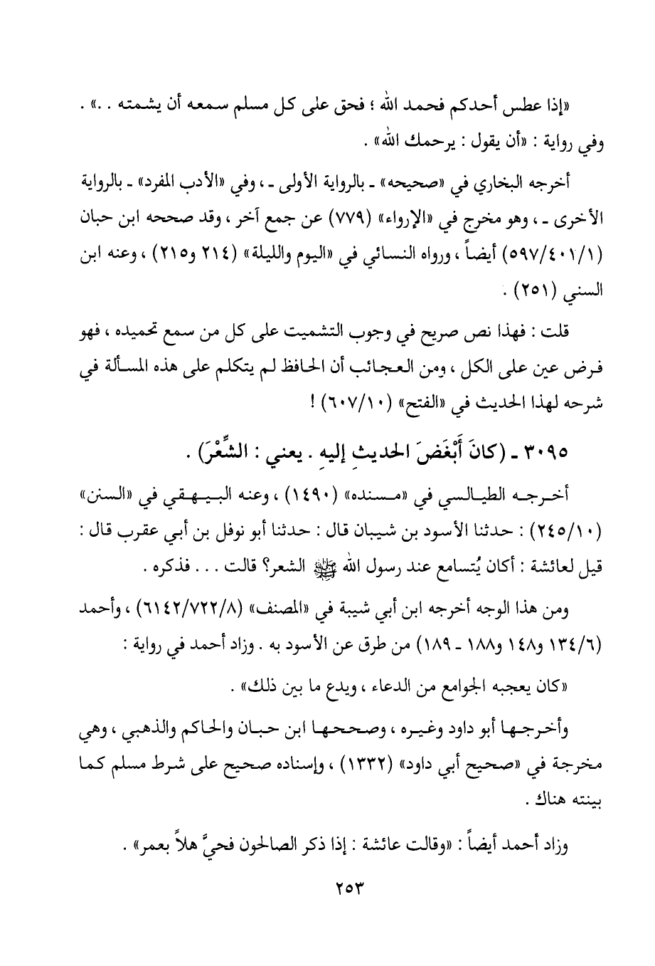 قلت: فهذا نص صريح في وجوب التشميت على كل من سمع تحميده، فهو فرض عين على الكل، ومن العجائب أن الحافظ لم يتكلم على هذه المسألة في شرحه لهذا الحديث في "الفتح " (10/607) ! *