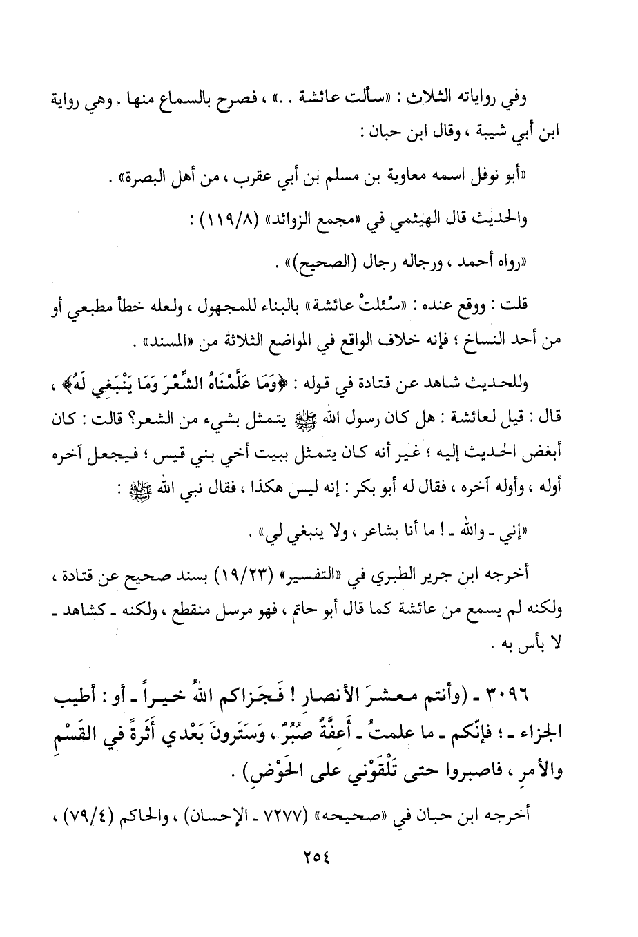 وللحديث شاهد عن قتادة في قوله: (وما علمناها الشعر وما ينبغي له) ، قال: قيل لعائشة: هل كان رسول الله - صلى الله عليه وسلم - يتمثل بشيء من الشعر؟ قالت: كان أبغض الحديث إليه، غير أنه كان يتمثل ببيت أخي بني قيس؛ فيجعل آخره أوله، وأوله آخره، فقال له أبو بكر: إنه ليس هكذا، فقال نبي الله- صلى الله عليه وسلم -:
