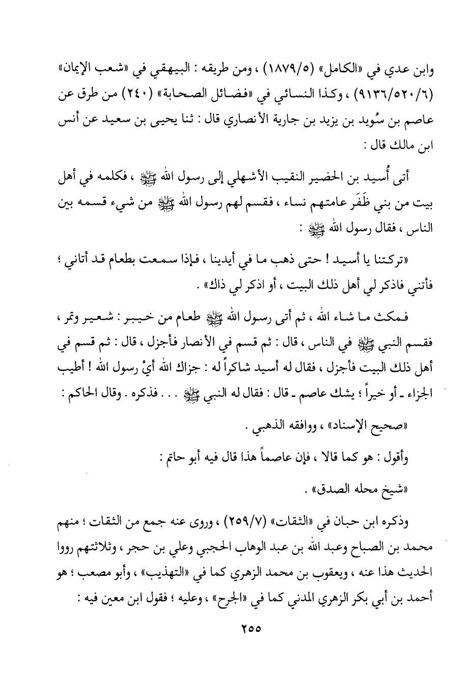 وابن عدي في "الكامل " (5/1879) ، ومن طريقه: البيهقي في "شعب الإيمان " (6/520/9136) ، وكذا النسائي في "فضائل الصحابة" (240) من طرق عن عاصم بن سويد بن يزيد بن جارية الأنصاري قال: ثنا يحيى بن سعيد عن أنس ابن مالك قال: