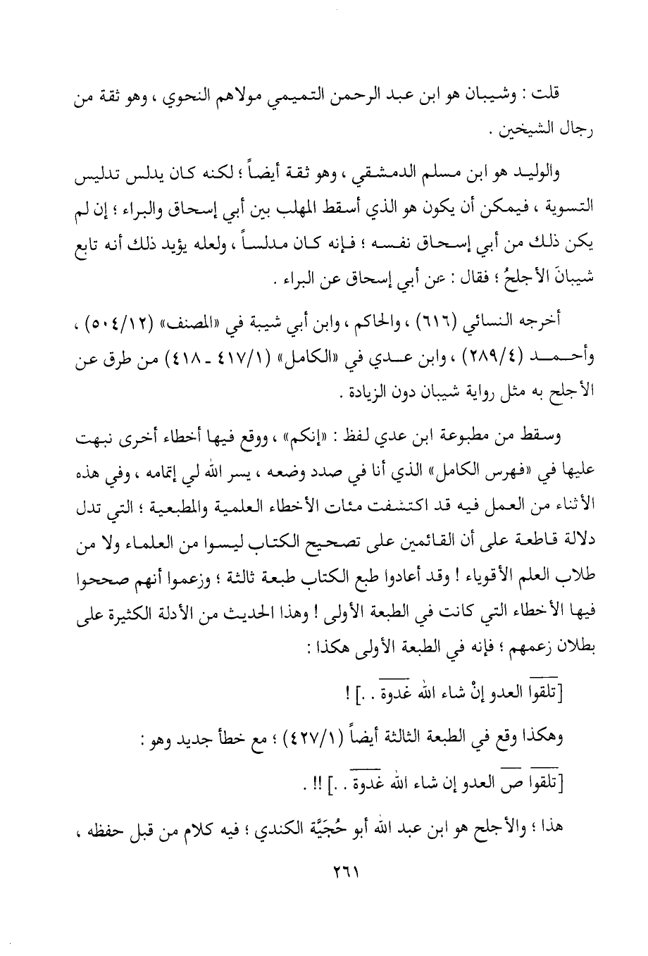 وسقط من مطبوعة ابن عدي لفظ: "إنكم "، ووقع فيها أخطاء أخرى نبهت عليها في "فهرس الكامل " الذي أنا في صدد وضعه، يسر الله لي إتمامه، وفي هذه الأثناء من العمل فيه قد اكتشفت مئات الأخطاء العلمية والمطبعية؛ التي تدل دلالة قاطعة على أن القائمين على تصحيح الكتاب ليسوا من العلماء ولا من طلاب العلم الأقوياء! وقد أعادوا طبع الكتاب طبعة ثالثة؛ وزعموا أنهم صححوا فيها الأخطاء التي كانت في الطبعة الأولى! وهذا الحديث من الأدلة الكثيرة على بطلان زعمهم؛ فإنه في الطبعة الأولى هكذا: