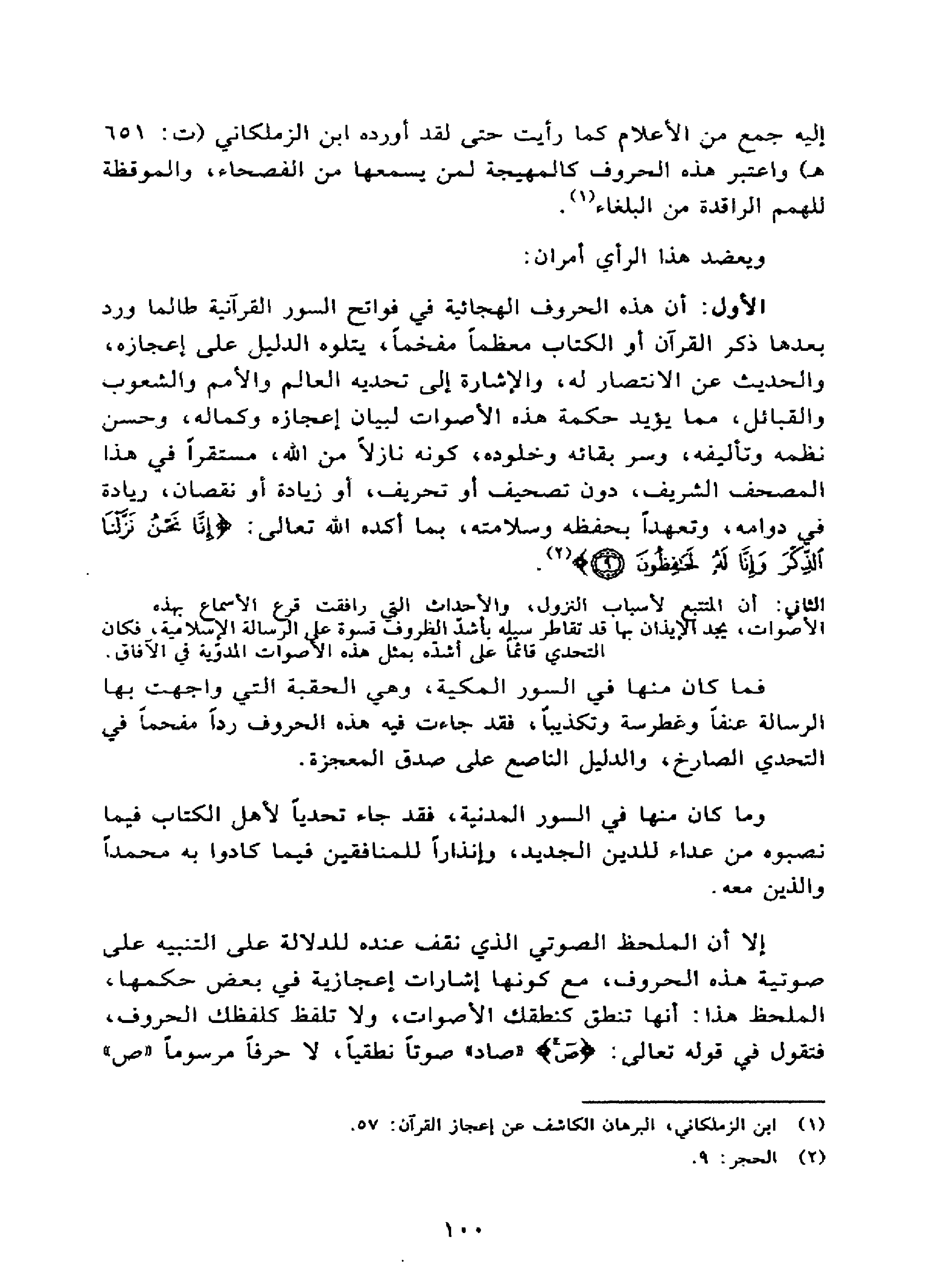 الأول: أن هذه الحروف الهجائية في فواتح السور القرآنية طالما ورد بعدها ذكر القرآن أو الكتاب معظماً مفخماً، يتلوه الدليل على إعجازه، والحديث عن الانتصار له، والإشارة إلى تحديه العالم والأمم والشعوب والقبائل، مما يؤيد حكمة هذه الأصوات لبيان إعجازه وكماله، وحسن نظمه وتأليفه، وسر بقائه وخلوده، كونه نازلاً من الله، مستقراً في هذا المصحف الشريف، دون تصحيف أو تحريف، أو زيادة أو نقصان، ريادة في دوامه، وتعهداً بحفظه وسلامته، بما أكده الله تعالى: (إنا نحن نزّلنا الذكر وإنا له لحافظون) (2).