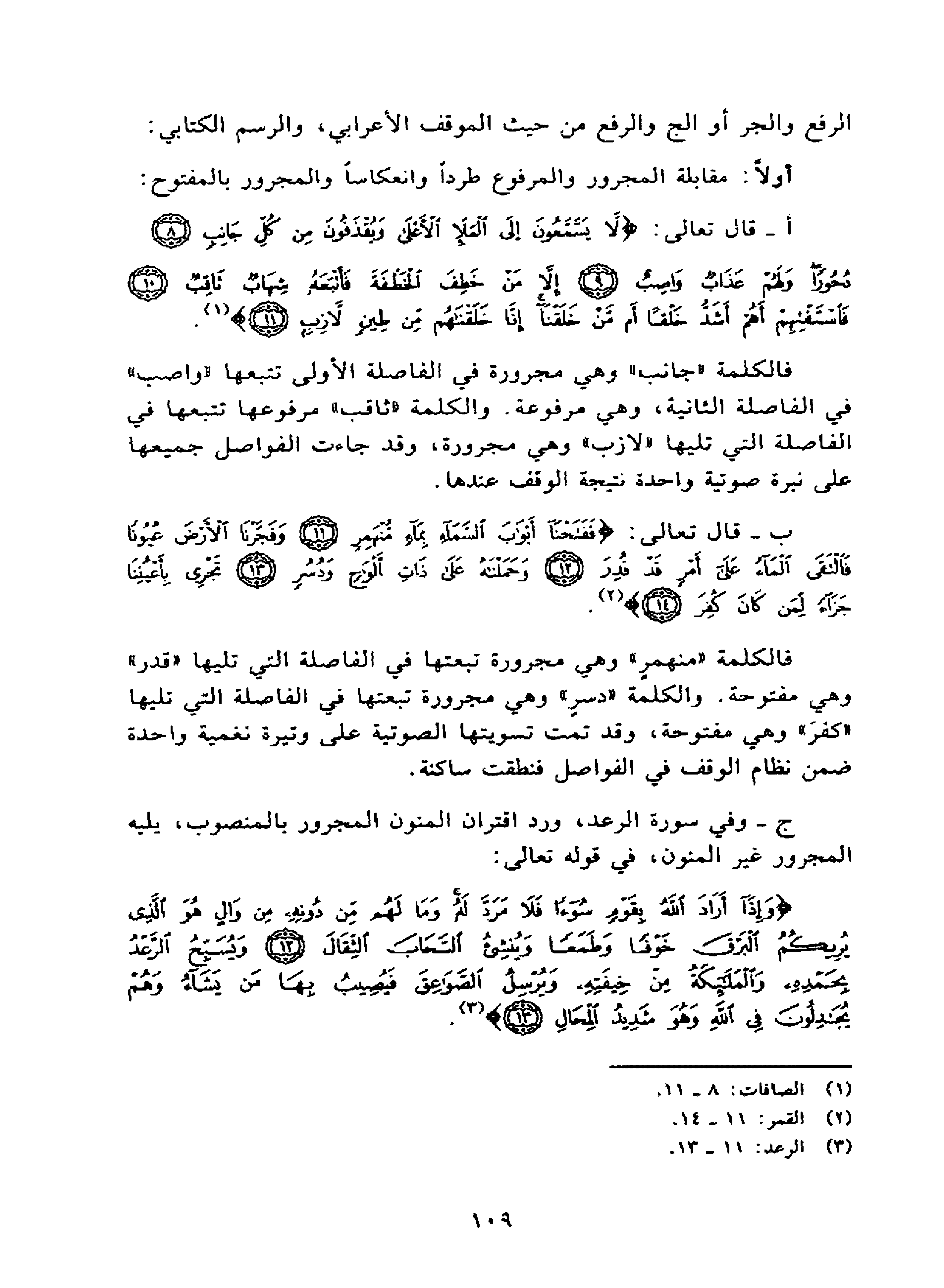 فالكلمة «جانب» وهي مجرورة في الفاصلة الأولى تتبعها «واصب» في الفاصلة الثانية، وهي مرفوعة. والكلمة «ثاقب» مرفوعها تتبعها في الفاصلة التي تليها «لازب» وهي مجرورة، وقد جاءت الفواصل جميعها على نبرة صوتية واحد نتيجة الوقف عندها.