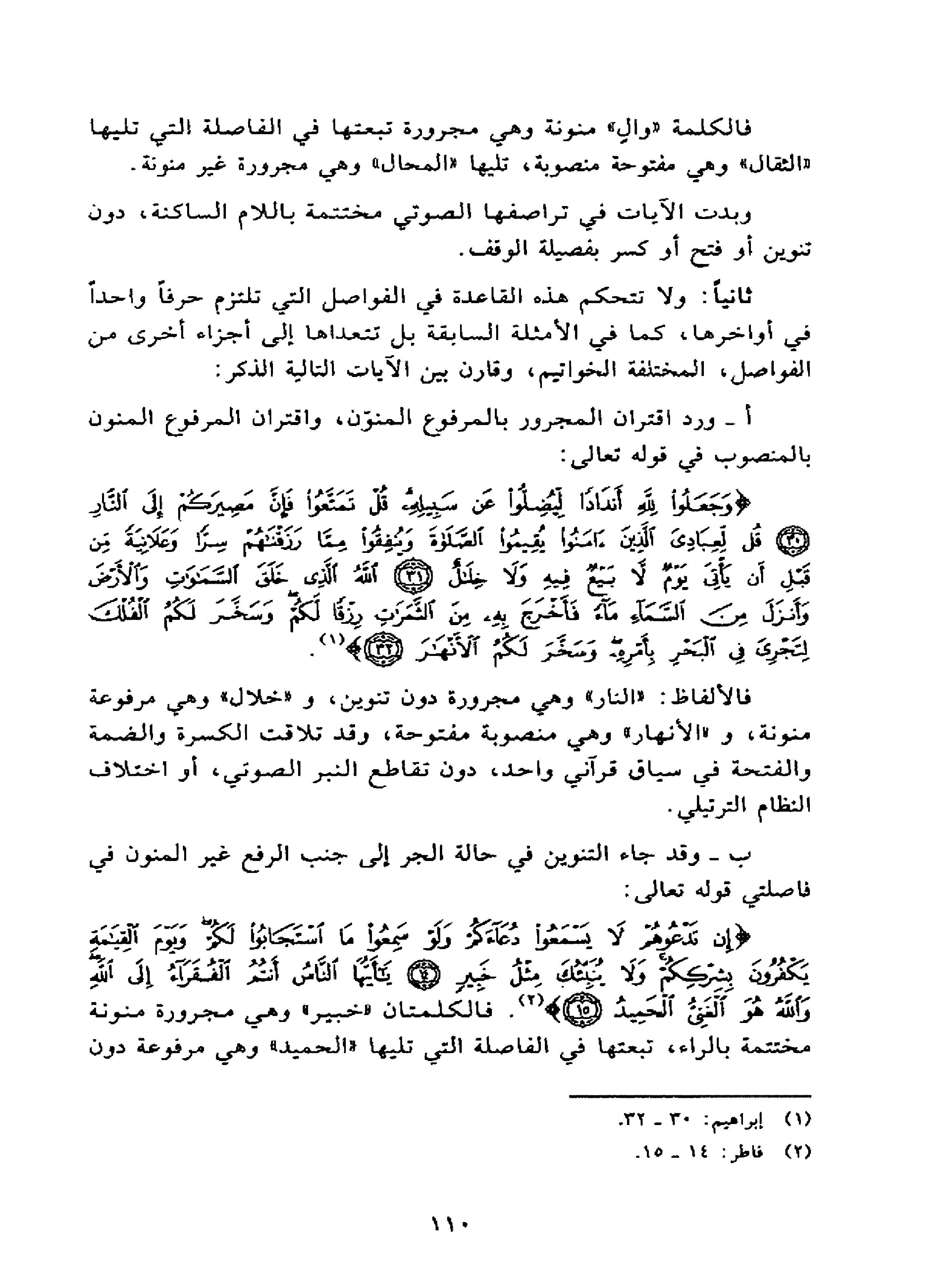 ب ـ وقد جاء التنوين في حالة الجر إلى جنب الرفع غير المنون في فاصلتي قوله تعالى: