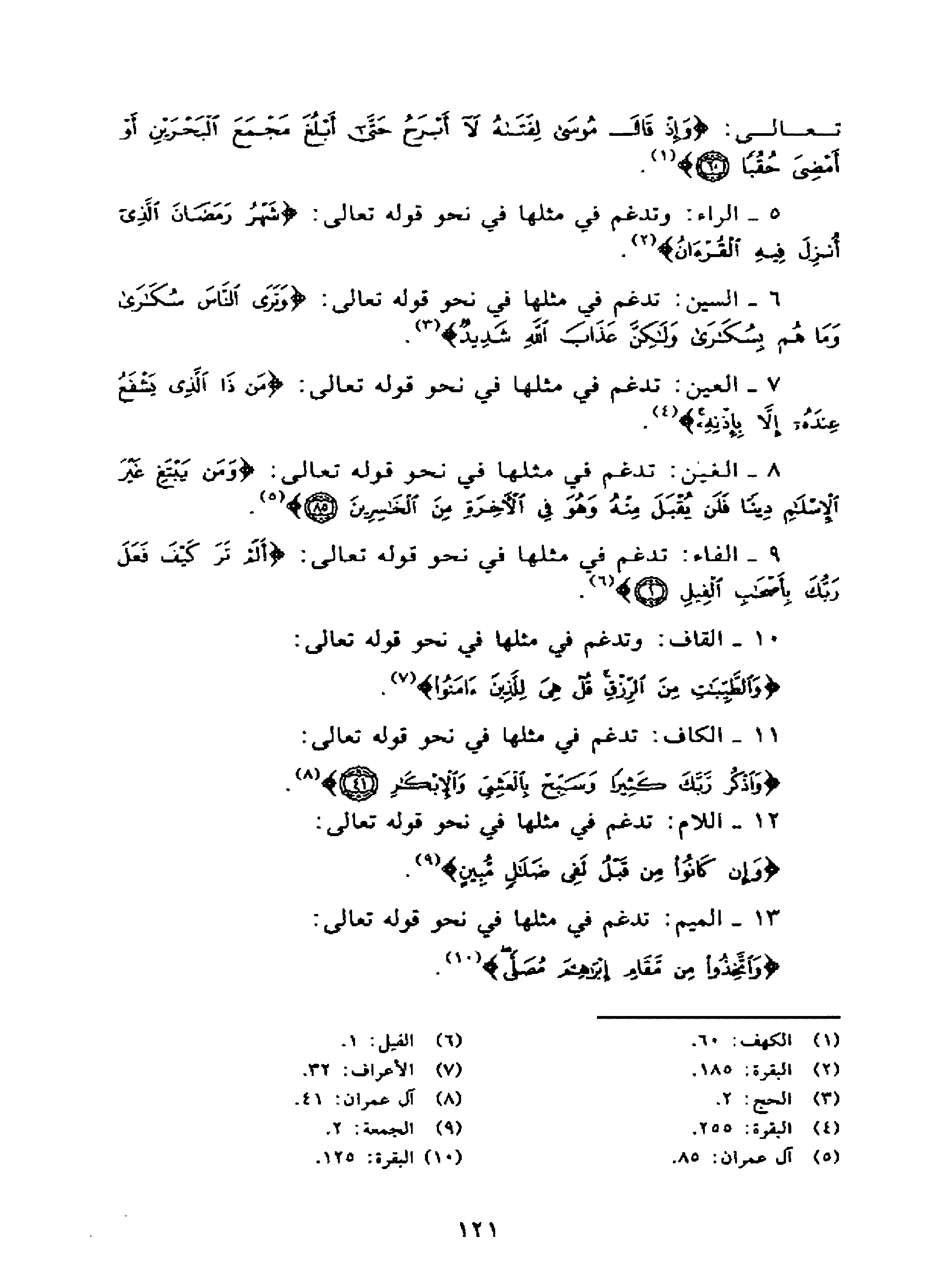 5 ـ الراء: وتدغم في مثلها في نحو قوله تعالى: (شهر رمضان الذي أنزل فيه القرآن) (2).