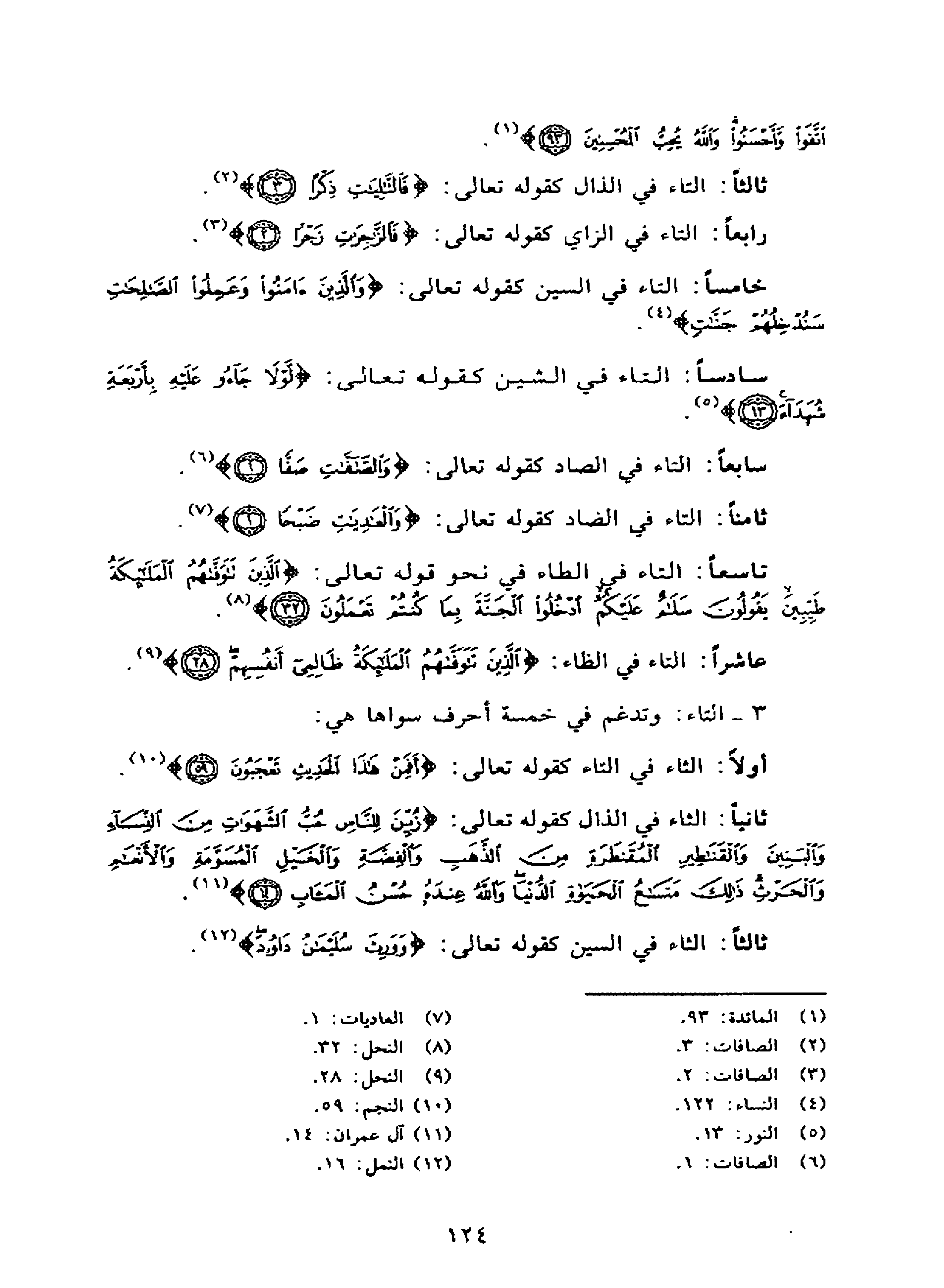 تاسعاً: التاء في الطاء في نحو قوله تعالى: (الذين تتوفاهم الملائكة طيبين يقولون سلام عليكم ادخلو الجنة بما كنتم تعملون) (8).