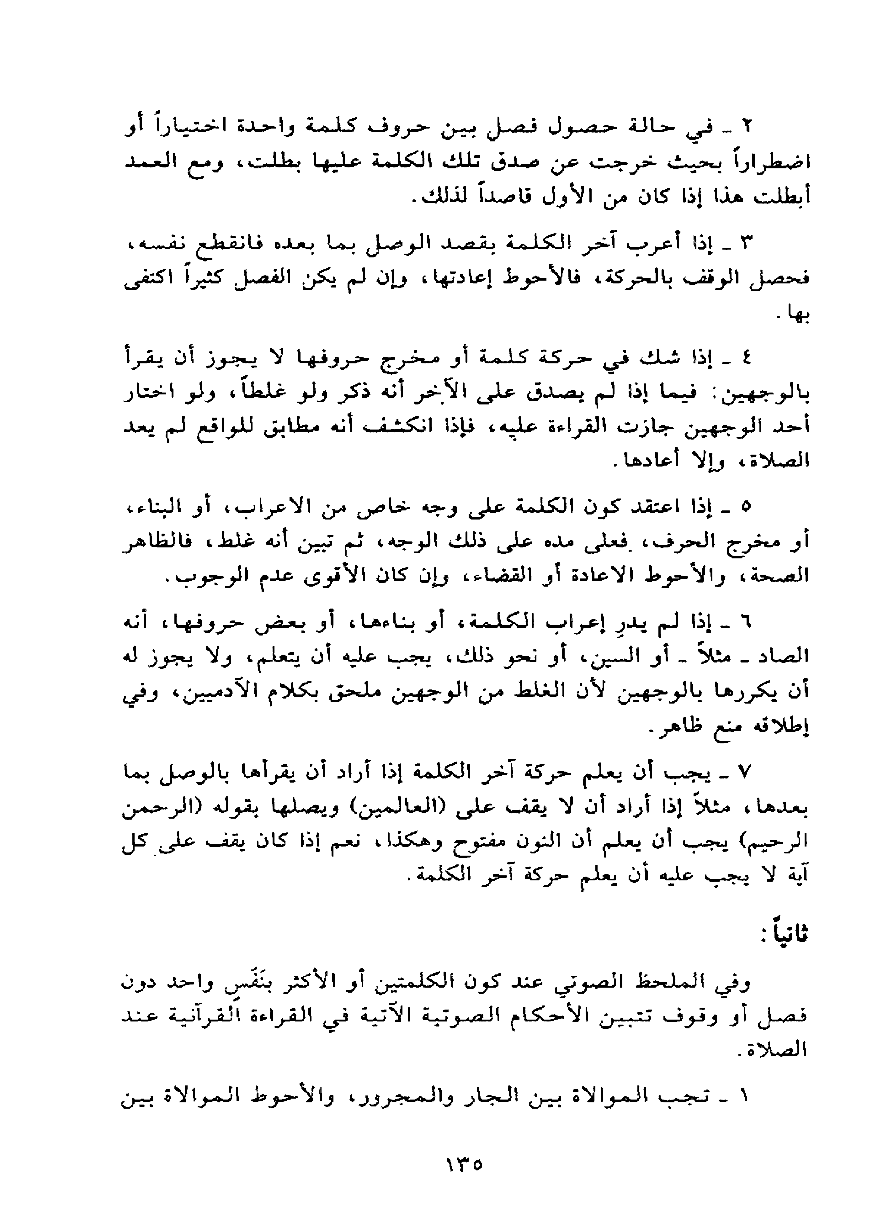 7 ـ يجب أن يعلم حركة آخر الكلمة إذا أراد أن يقرأها بالوصل بما بعدها، مثلاً إذا أراد أن لا يقف على (العالمين) ويصلها بقوله (الرحمن الرحيم) يجب أن يعلم أن النون مفتوح وهكذا، نعم إذا كان يقف على كل آية لا يجب عليه أن يعلم حركة آخر الكلمة.