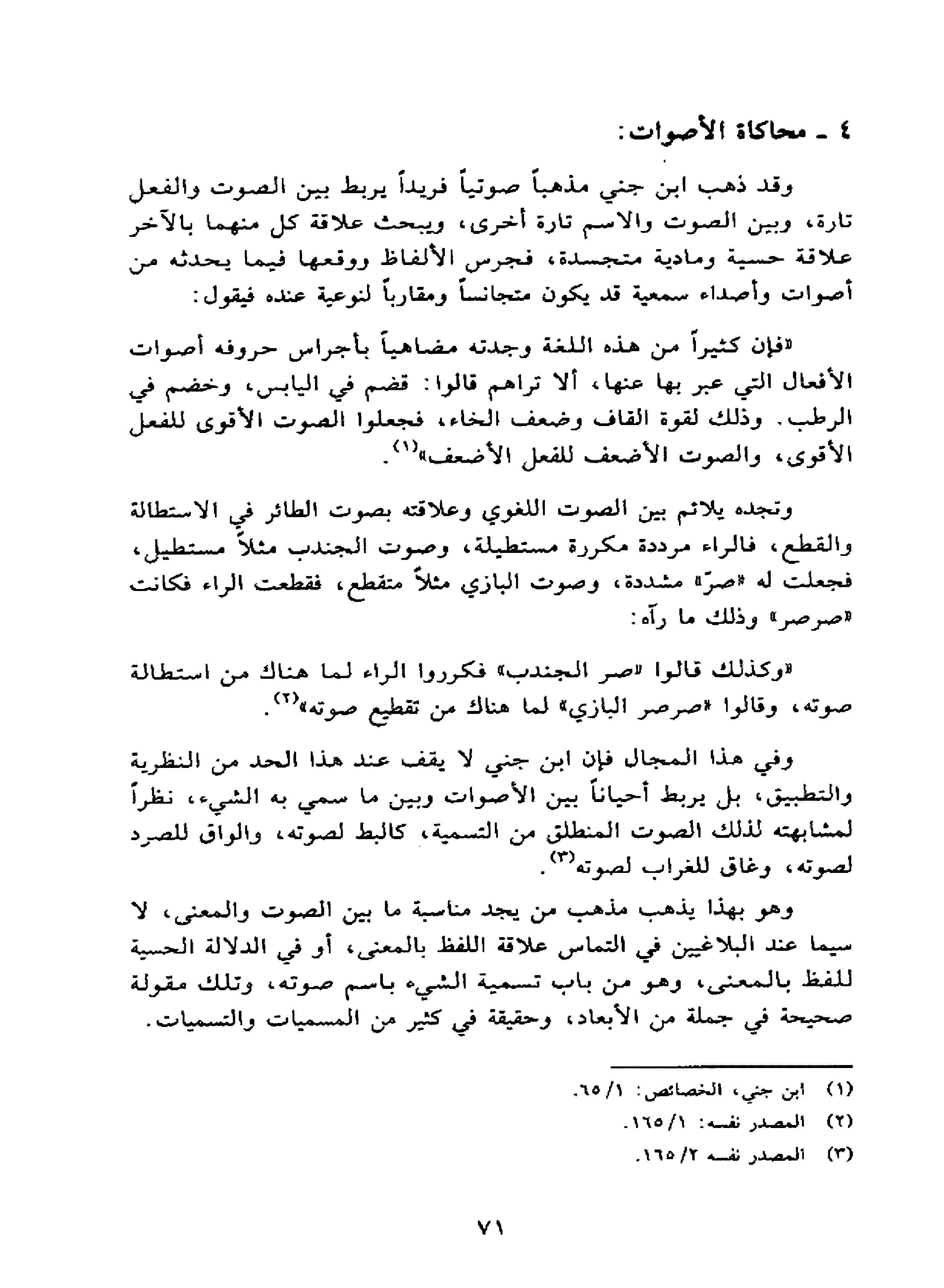 وفي هذا المجال فإن ابن جني لا يقف عند هذا الحد من النظرية والتطبيق، بل يربط أحياناً بين الأصوات وبين ما سمي به الشيء، نظراً لمشابهته لذلك الصوت المنطلق من التسمية، كالبط لصوته، والواق للصرد لصوته، وغاق للغراب لصوته (3).