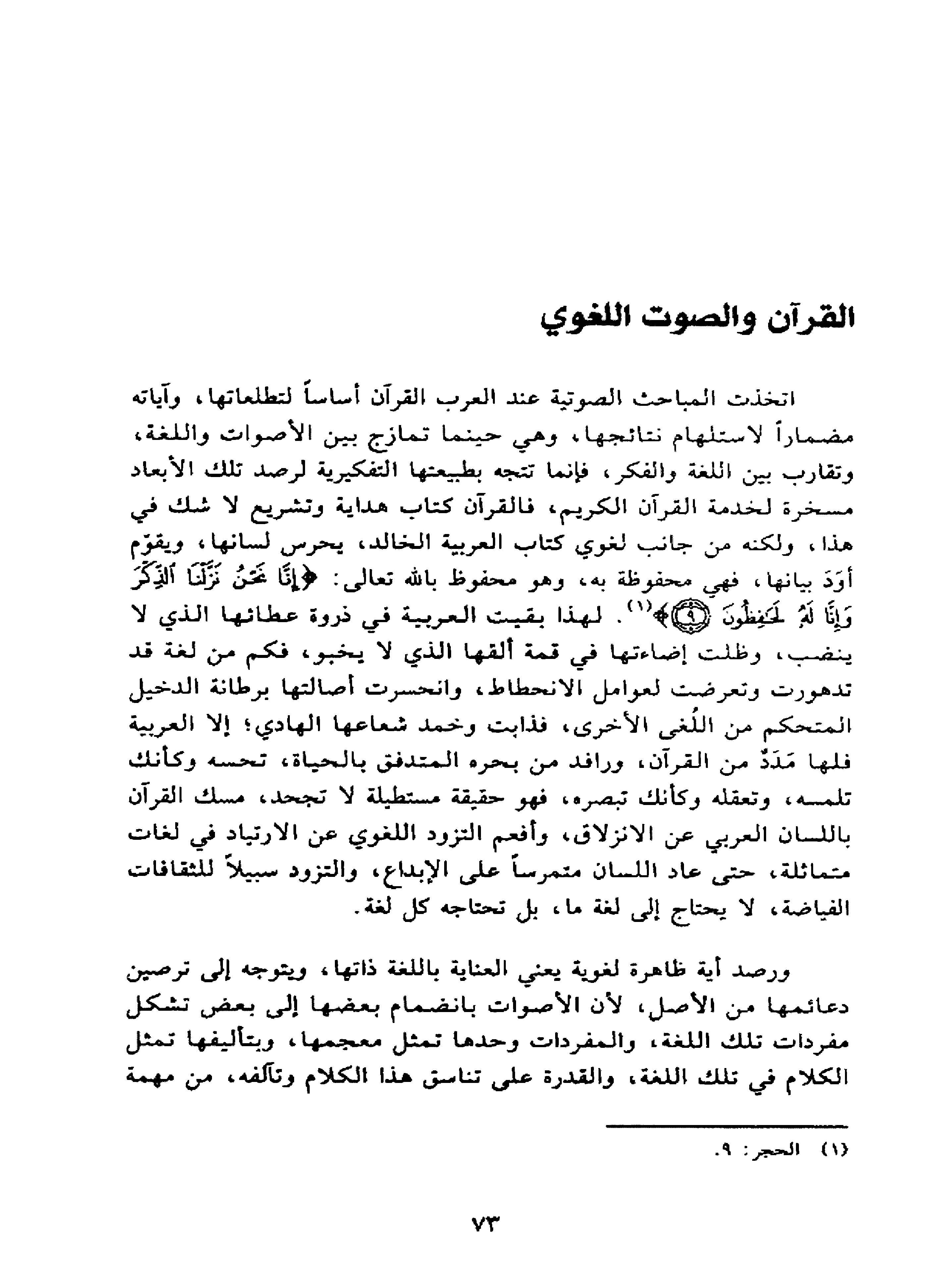 اتخذت المباحث الصوتية عند العرب القرآن أساساً لتطلعاتها، وآياته مضماراُ لاستلهام نتائجها، وهي حينما تمازج بين الأصوات واللغة، وتقارب بين اللغة والفكر، فإنما تتجه بطبيعتها التفكيرية لرصد تلك الأبعاد مسخرة لخدمة القرآن الكريم، فالقرآن كتاب هداية وتشريع لا شك في هذا، ولكنه من جانب لغوي كتاب العربية الخالد، يحرس لسانها، ويقوّم أود بيانها، فهي محفوظة به، وهو محفوظ بالله تعالى: (إنا نحن نزلنا الذكر وإنا له لحفظون) (1). لهذا بقيت العربية في ذروة عطائها الذي لا ينضب، وظلت إضاءتها في قمة ألقها الذي لا يخبو، فكم من لغة قد تدهورت وتعرضت لعوامل الانحطاط، وانحسرت أصالتها برطانة الدخيل المتحكم من اللغى الأخرى، فذابت وخمد شعاعها الهادي؛ إلا العربية فلها مدد من القرآن، ورافد من بحره المتدفق بالحياة، تحسه وكأنك تلمسه، وتعقله وكأنك تبصره، فهو حقيقة مستطيلة لا تجحد، مسك القرآن باللسان العربي عن الانزلاق، وأفعم التزود اللغوي عن الارتياد في لغات متماثلة، حتى عاد اللسان متمرساً على الإبداع، والتزود سبيلاً للثقافات الفياضة، لا يحتاج إلى لغة ما، بل تحتاجه كل لغة.