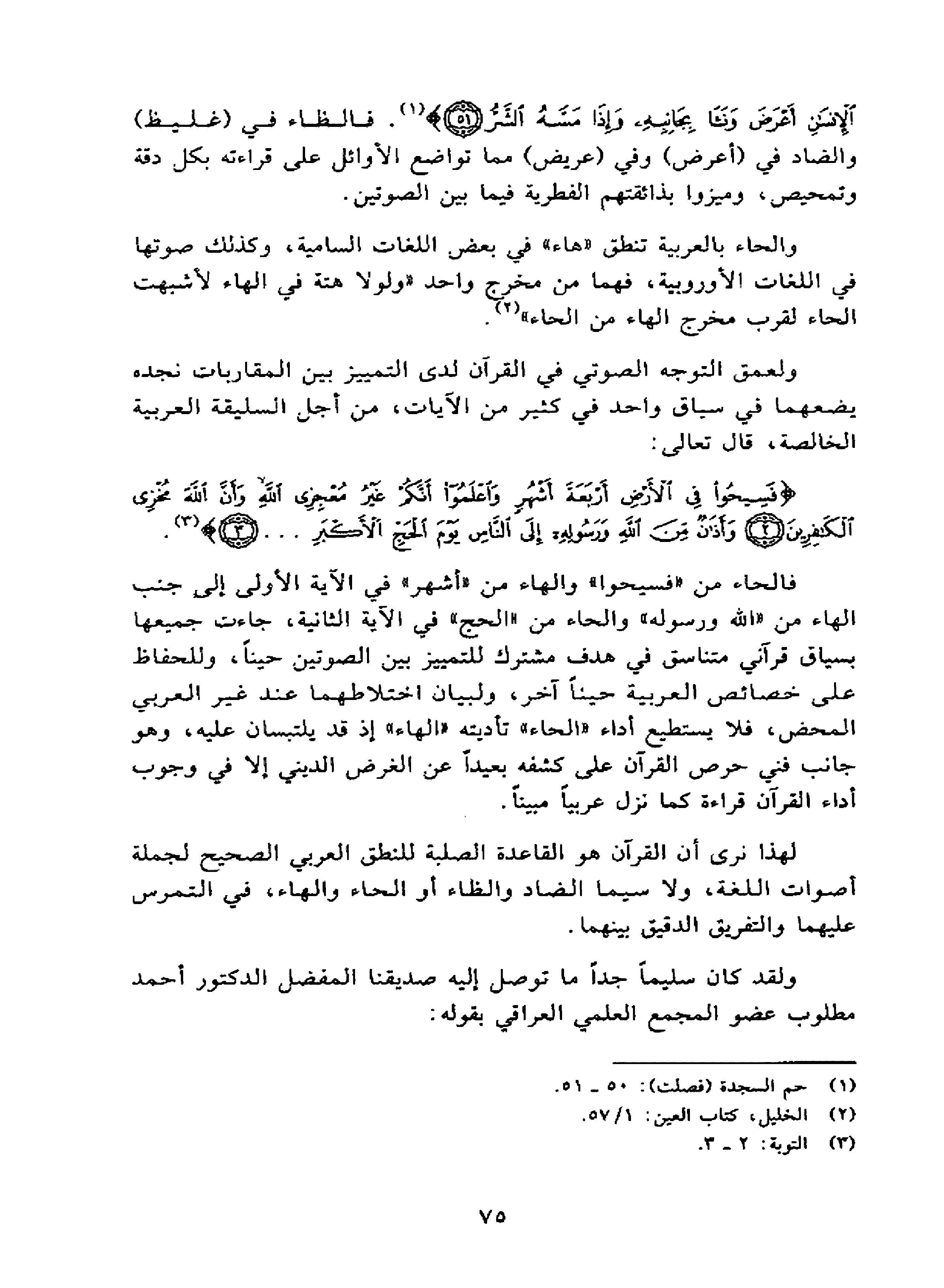 لهذا نرى أن القرآن هو القاعدة الصلبة للنطق العربي الصحيح لجملة أصوات اللغة، ولا سيما الضاد والظاء أوالحاء والهاء، في التمرس عليهما والتفريق الدقيق بينهما.