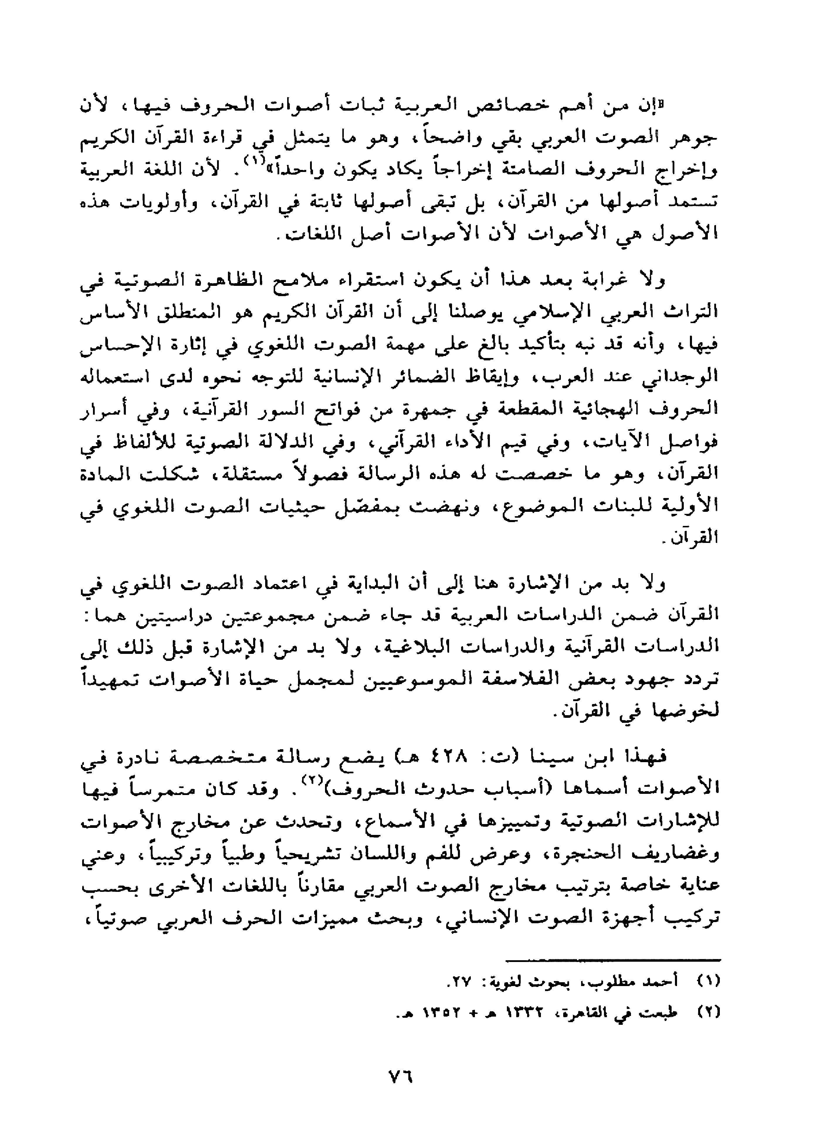 ولا بد من الإشارة هنا إلى أن البداية في اعتماد الصوت اللغوي في القرآن ضمن الدراسات العربية قد جاء ضمن مجموعتين دراستين هما: الدراسات القرآنية والدراسات البلاغية، ولا بد من الإشارة قبل ذلك إلى تردد جهود بعض الفلاسفة الموسوعيين لمجمل حياة الأصوات تمهيداً لخوضها في القرآن.