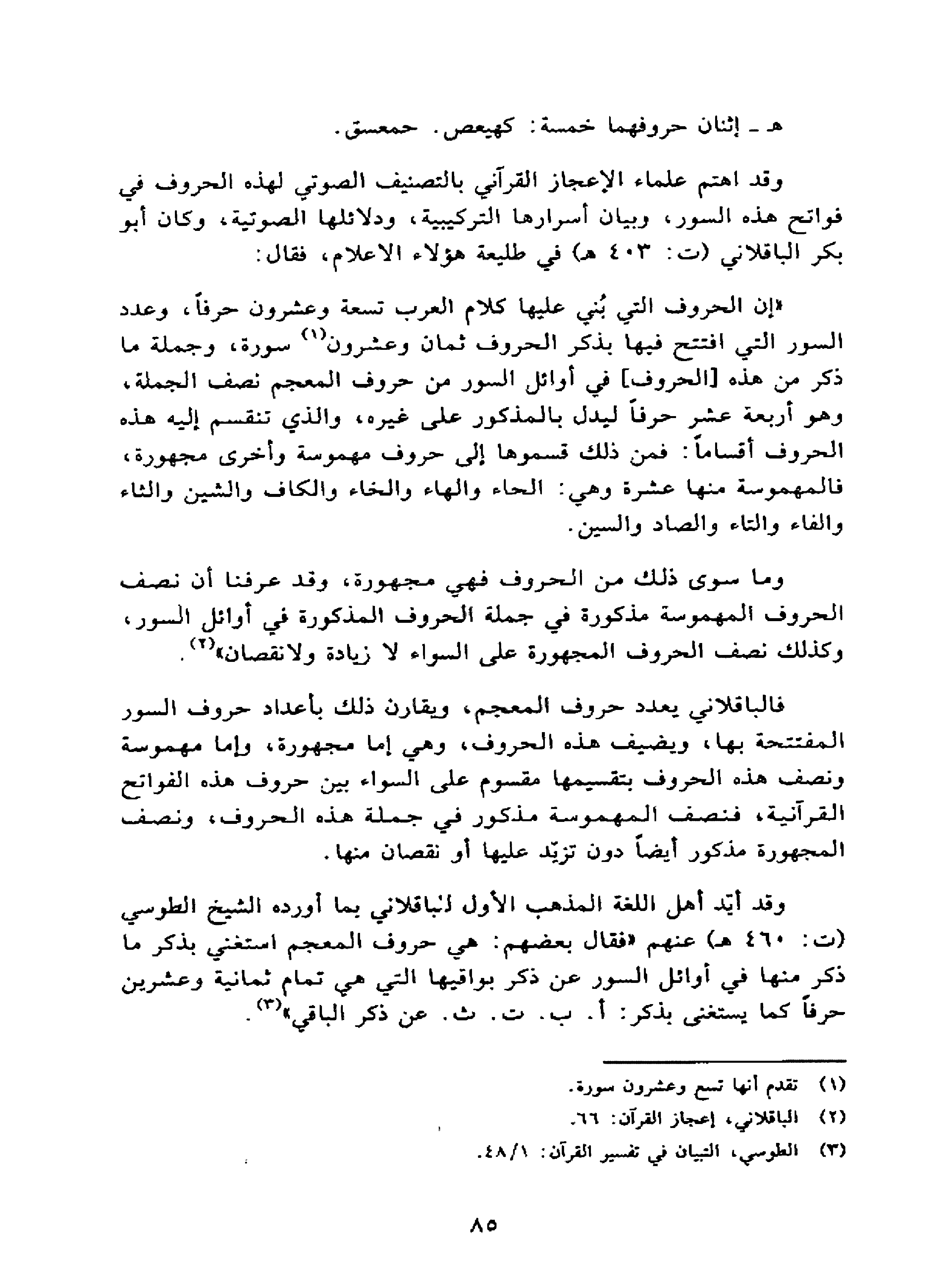فالباقلاني يعدد حروف المعجم، ويقارن ذلك بأعداد حروف السور المفتتحة بها، ويضيف هذه الحروف، وهي إما مجهورة، وإما مهموسة ونصف هذه الحروف بتقسيمها مقسوم على السواء بين حروف هذه الفواتح القرآنية، فنصف المهموسة مذكور في جملة هذه الحروف، ونصف المجهورة مذكور أيضاً دون تزيّد عليها أو نقصان منها.