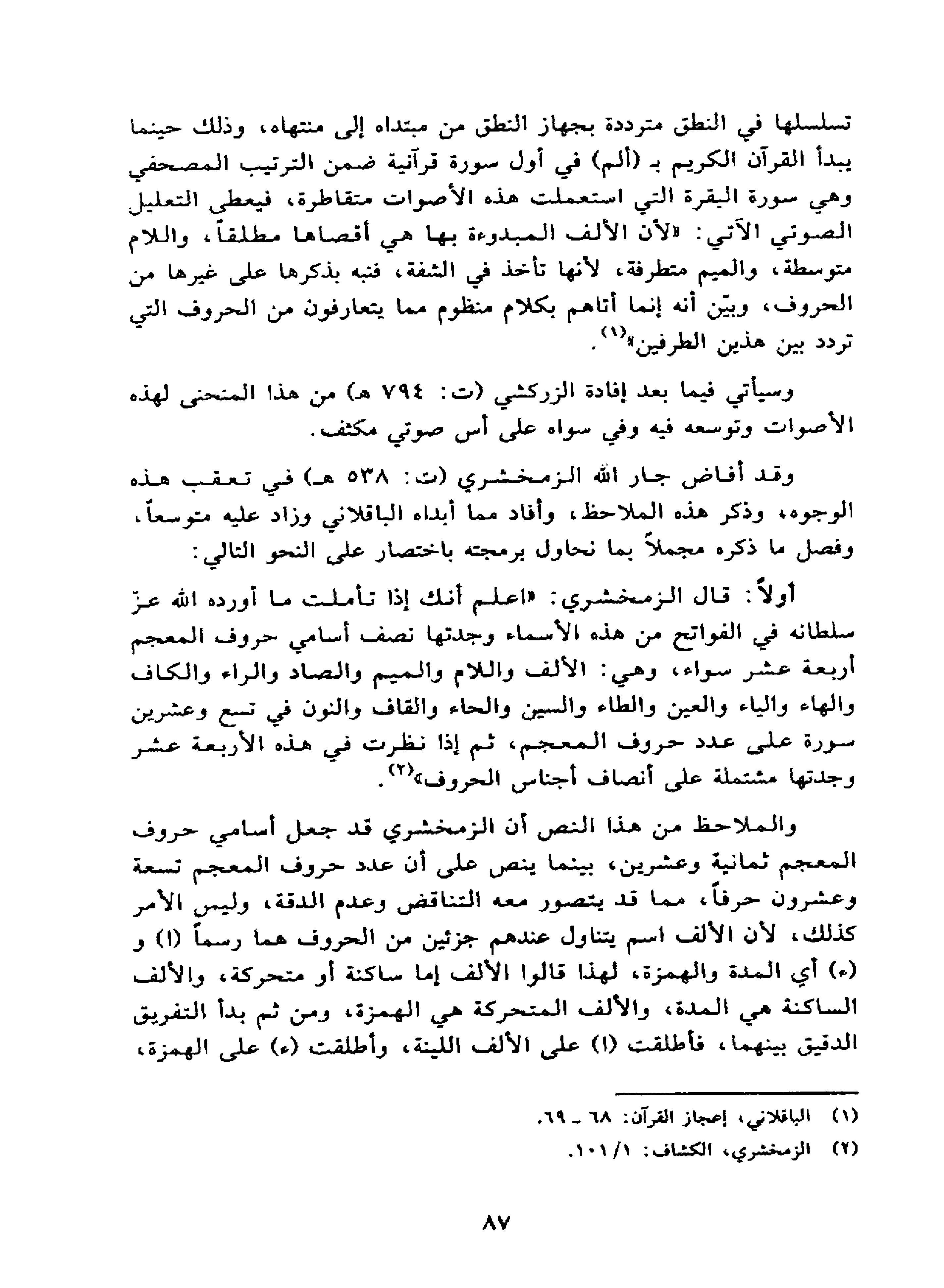 تسلسلها في النطق مترددة بجهاز النطق من مبتداه إلى منتهاه، وذلك حينما يبدأ القرآن الكريم بـ (ألم) في أول سورة قرآنية ضمن الترتيب المصحفي وهي سورة البقرة التي استعملت هذه الأصوات متقاطرة، فيعطي التعليل الصوتي الآتي: «لأن الألف المبدوءة بها هي أقصاها مطلقاً، واللام متوسطة، والميم متطرفة، لأنها تأخذ في الشفة، فنبه بذكرها على غيرها من الحروف، وبيّن أنه إنما أتاهم بكلام منظوم مما يتعارفون من الحروف التي تردد بين هذين الطرفين» (1).