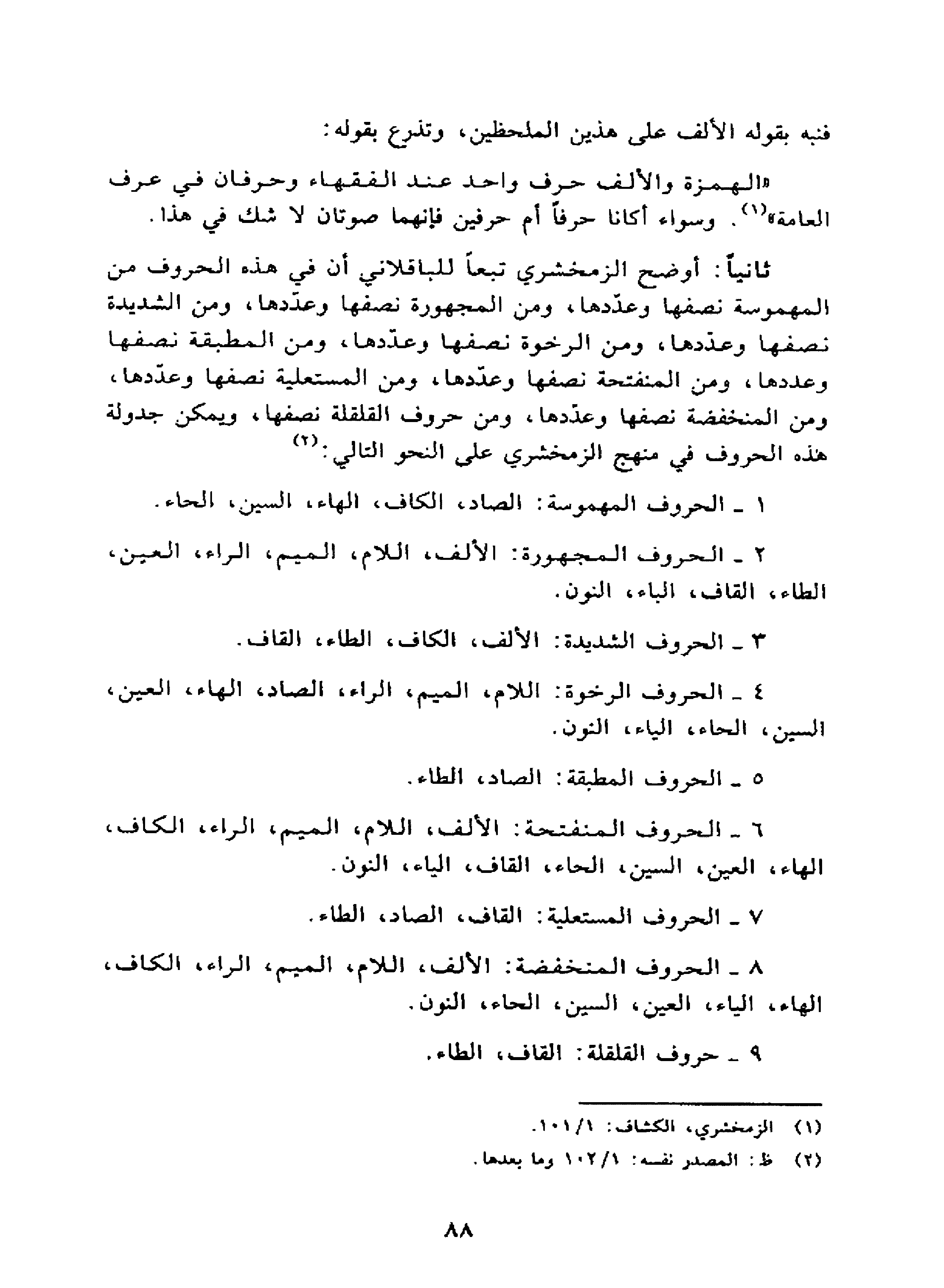 ثانياً: أوضح الزمخشري تبعاً للباقلاني أن في هذه الحروف من المهموسة نصفها وعدّدها، ومن المجهورة نصفها وعدّدها، ومن الشديدة نصفها وعدّدها، ومن الرخوة نصفها وعدّدها، ومن المطبقة نصفها وعددها، ومن المنفتحة نصفها وعدّدها، ومن المستعلية نصفها وعدّدها، ومن المنخفضة نصفها وعدّدها، ومن حروف القلقلة نصفها، ويمكن جدولة هذه الحروف في منهج الزمخشري على النحو التالي: (2)