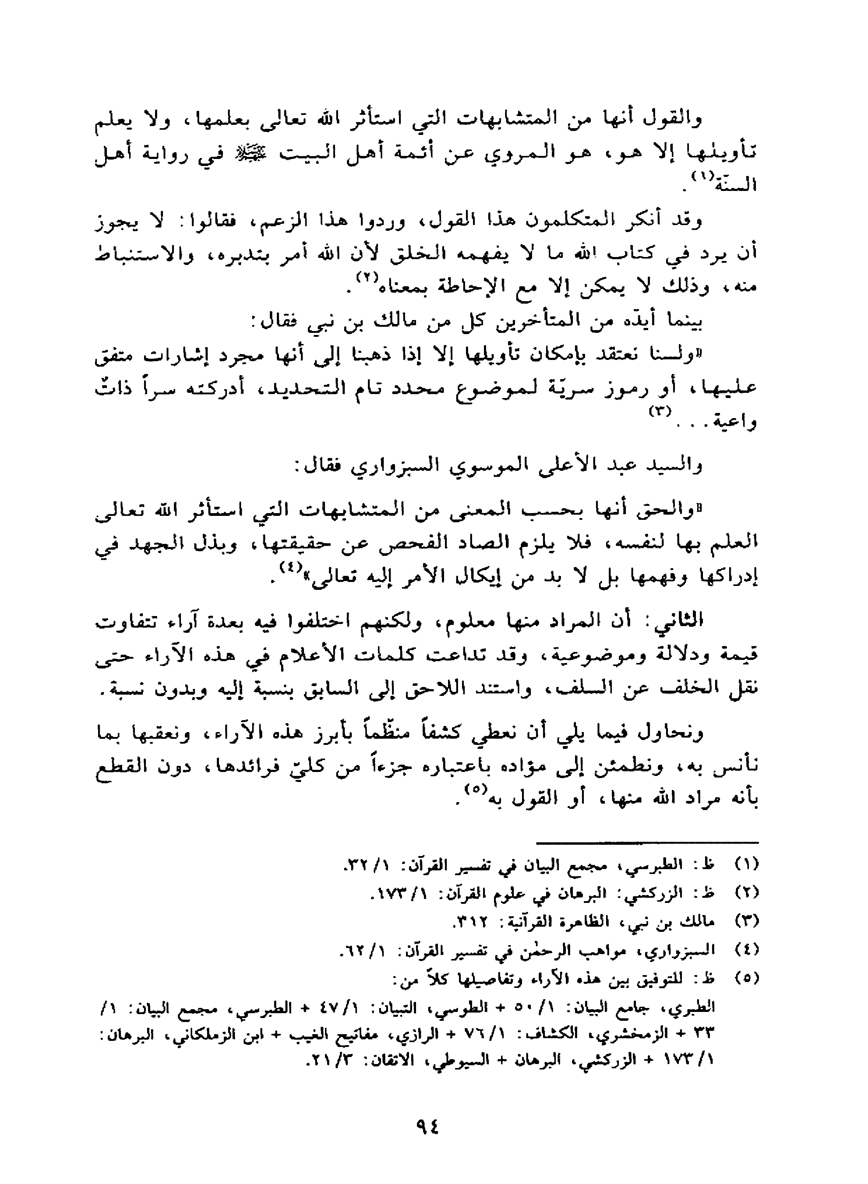 «والحق أنها بحسب المعنى من المتشابهات التي استأثر الله تعالى العلم بها لنفسه، فلا يلزم الصاد الفحص عن حقيقتها، وبذل الجهد في إدراكها وفهمها بل لا بد من إيكال الأمر إليه تعالى» (4).