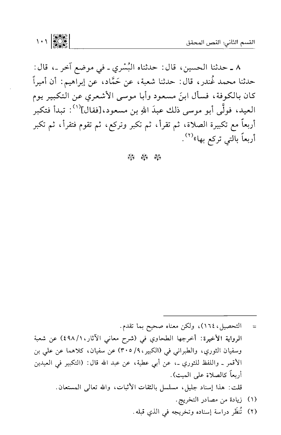 8 - حدثنا الحسين، قال: حدثناه البسري -في موضع آخر-، قال: حدثنا محمد غندر، قال: حدثنا شعبة، عن حماد، عن إبراهيم: أن أميرا كان بالكوفة، فسأل ابن مسعود وأبا موسى الأشعري عن التكبير يوم العيد، فولى أبو موسى ذلك عبد الله بن مسعود، [فقال]: تبدأ فتكبر أربعا مع تكبيرة الصلاة، ثم تقرأ، ثم تكبر وتركع، ثم تقوم فتقرأ، ثم تكبر أربعا بالتي تركع بها".