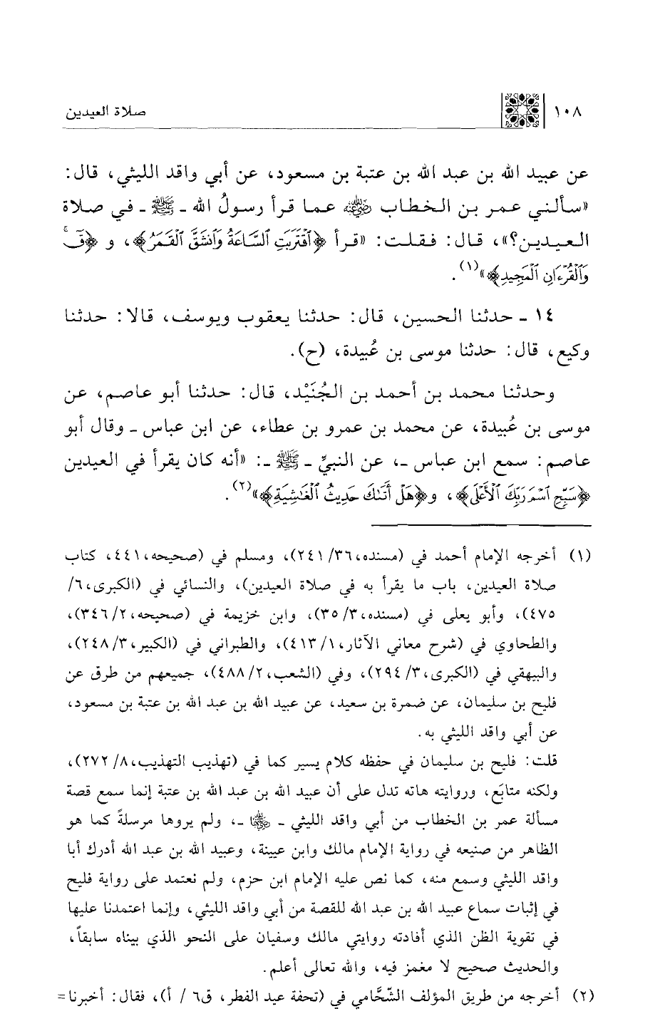 وحدثنا محمد بن أحمد بن الجنيد، قال: حدثنا أبو عاصم، عن موسى بن عبيدة، عن محمد بن عمرو بن عطاء، عن ابن عباس - وقال أبو عاصم: سمع ابن عباس-، عن النبي - صلى الله عليه وسلم -: "أنه كان يقرأ في العيدين {سبح اسم ربك الأعلى}، و {هل أتاك حديث الغاشية} ".
