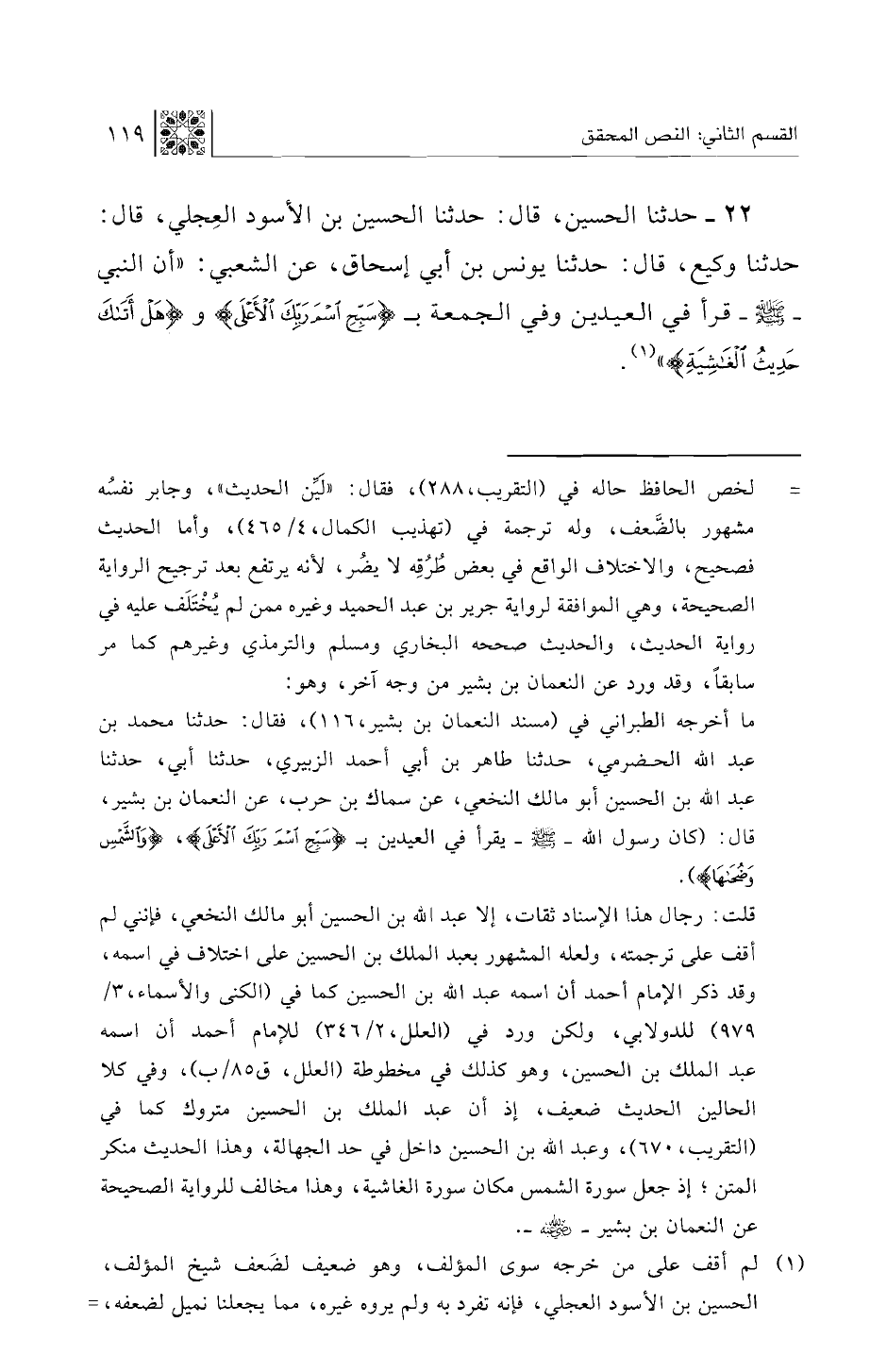 22 - حدثنا الحسين، قال: حدثنا الحسين بن الأسود العجلي، قال: حدثنا وكيع، قال: حدثنا يونس بن أبي إسحاق، عن الشعبي: "أن النبي - صلى الله عليه وسلم - قرأ في العيدين وفي الجمعة بـ {سبح اسم ربك الأعلى} و {هل أتاك حديث الغاشية} ".