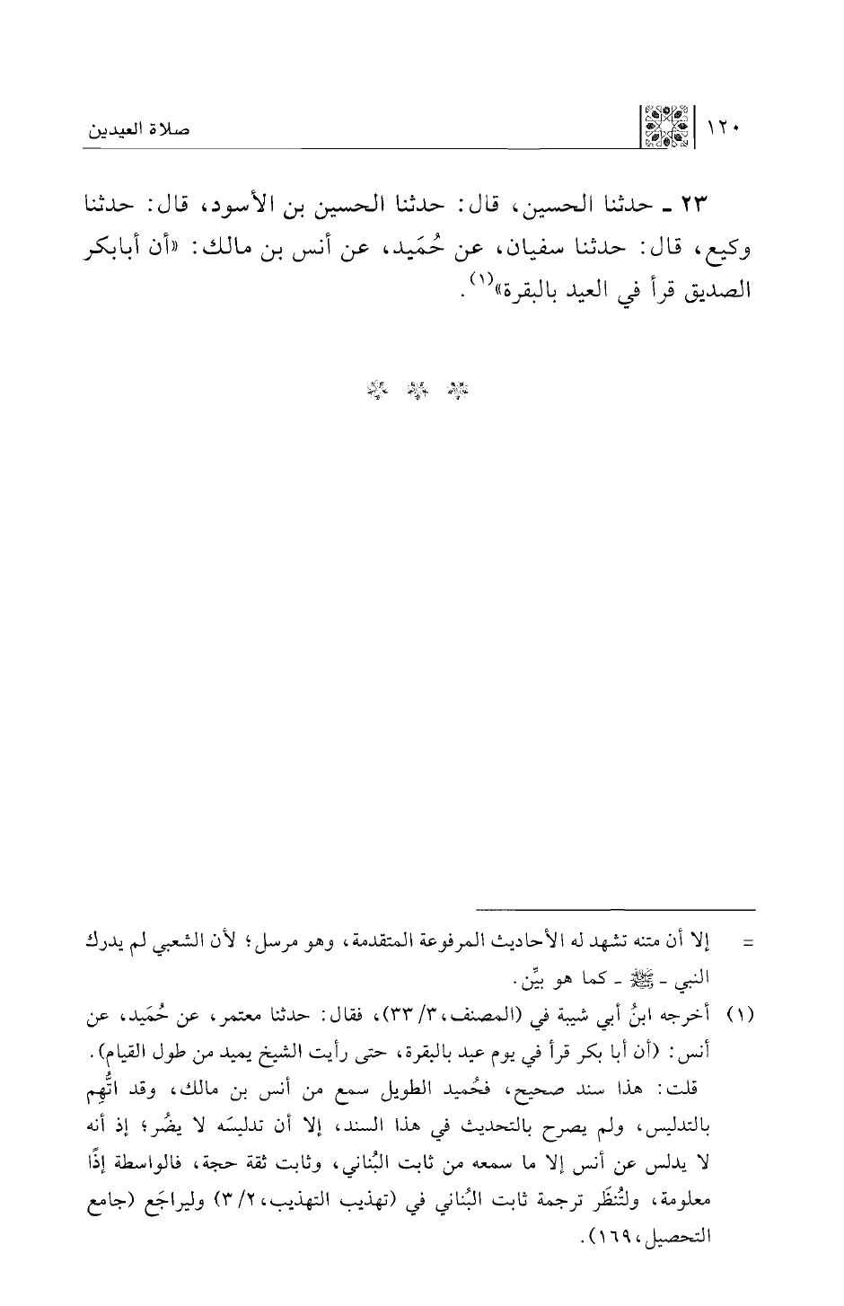 23 - حدثنا الحسين، قال: حدثنا الحسين بن الأسود، قال: حدثنا وكيع، قال: حدثنا سفيان، عن حميد، عن أنس بن مالك: "أن أبا بكر الصديق قرأ في العيد بالبقرة".