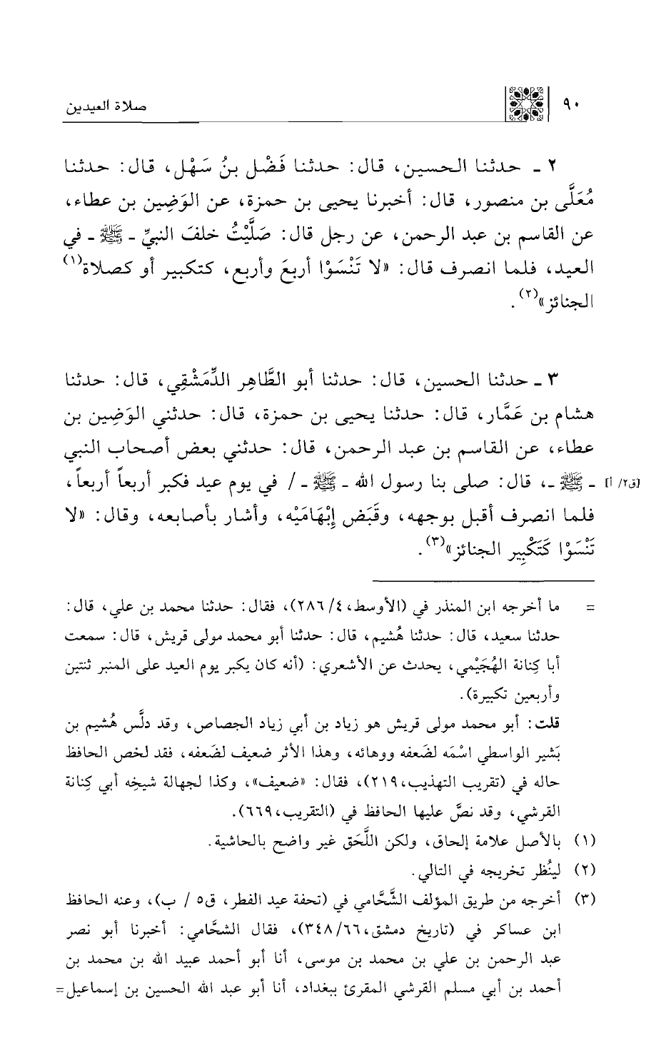 3 - حدثنا الحسين، قال: حدثنا أبو الطاهر الدمشقي، قال: حدثنا هشام بن عمار، قال: حدثنا يحيى بن حمزة، قال: حدثني الوضين بن عطاء، عن القاسم بن عبد الرحمن، قال: حدثني بعض أصحاب النبي - صلى الله عليه وسلم - قال: صلى بنا رسول الله صلى الله عليه وسلم في يوم عيد فكبر أربعا أربعا، فلما انصرف أقبل بوجهه، وقبض إبهاميه، وأشار بأصابعه، وقال: "لا تنسوا كتكبير الجنائز".