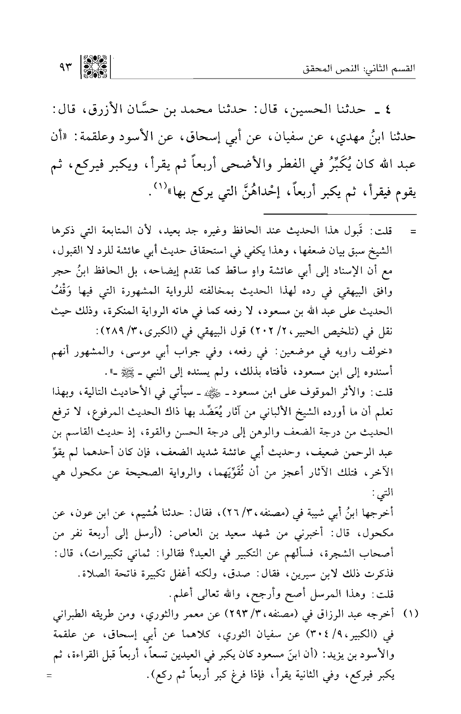 4 - حدثنا الحسين، قال: حدثنا محمد بن حسان الأزرق، قال: حدثنا ابن مهدي، عن سفيان، عن أبي إسحاق، عن الأسود وعلقمة: "أن عبد الله كان يكبر في الفطر والأضحى أربعا ثم يقرأ، ويكبر فيركع، ثم يقوم فيقرأ، ثم يكبر أربعا، إحداهن التي يركع بها".
