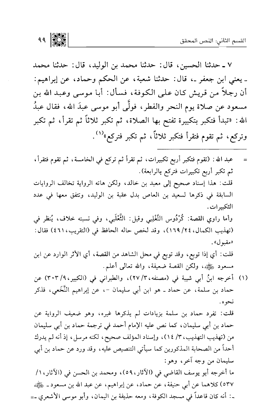 7 - حدثنا الحسين، قال: حدثنا محمد بن الوليد، قال: حدثنا محمد -يعني ابن جعفر-، قال: حدثنا شعبة، عن الحكم وحماد، عن إبراهيم: أن رجلا من قريش كان على الكوفة، فسأل: أبا موسى وعبد الله بن مسعود عن صلاة يوم النحر والفطر، فولى أبو موسى عبد الله، فقال عبد الله: "تبدأ فتكبر بتكبيرة تفتح بها الصلاة، ثم تكبر ثلاثا ثم تقرأ، ثم تكبر وتركع، ثم تقوم فتقرأ فتكبر ثلاثا، ثم تكبر فتركع".