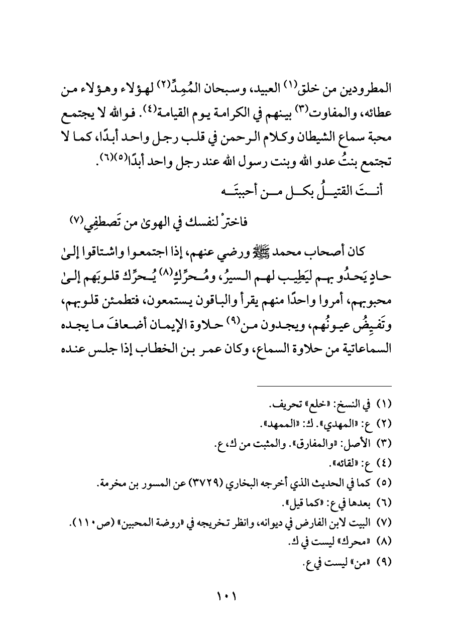 المطرودين من خلق (¬١) العبيد، وسبحان المُمِدِّ (¬٢) لهؤلاء وهؤلاء من عطائه، والمفاوت (¬٣) بينهم في الكرامة يوم القيامة (¬٤). فوالله لا يجتمع محبة سماع الشيطان وكلام الرحمن في قلب رجل واحد أبدًا، كما لا تجتمع بنتُ عدو الله وبنت رسول الله عند رجل واحد أبدًا (¬٥) (¬٦).