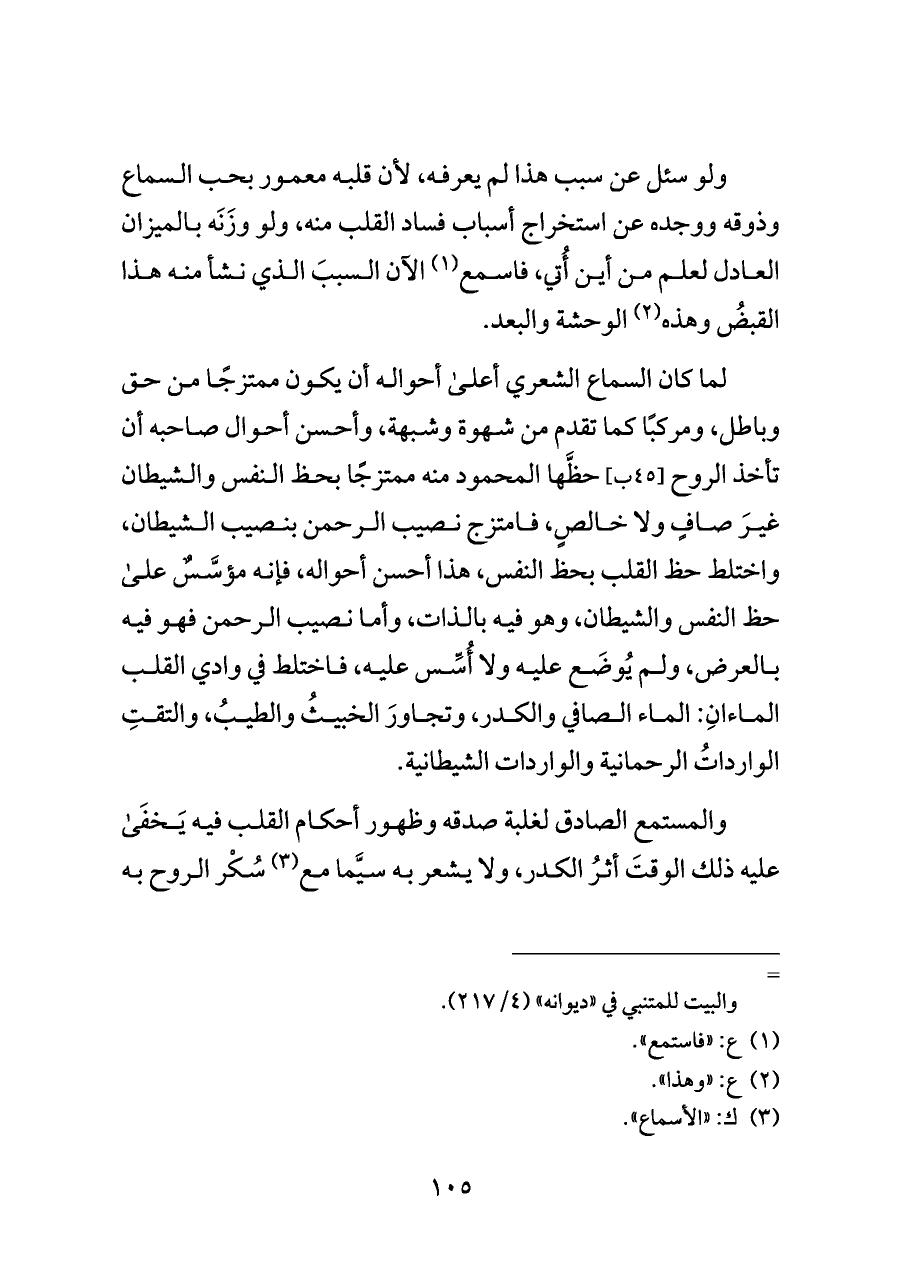 لما كان السماع الشعري أعلى أحواله أن يكون ممتزجًا من حق وباطل، ومركبًا كما تقدم من شهوة وشبهة، وأحسن أحوال صاحبه أن تأخذ الروح [٤٥ ب] حظَّها المحمود منه ممتزجًا بحظ النفس والشيطان غيرَ صافٍ ولا خالصٍ، فامتزج نصيب الرحمن بنصيب الشيطان، واختلط حظ القلب بحظ النفس، هذا أحسن أحواله، فإنه مؤسَّسٌ على حظ النفس والشيطان، وهو فيه بالذات، وأما نصيب الرحمن فهو فيه بالعرض، ولم يُوضَع عليه ولا أُسِّس عليه، فاختلط في وادي القلب الماءانِ: الماء الصافي والكدر، وتجاورَ الخبيثُ والطيبُ، والتقتِ الوارداتُ الرحمانية والواردات الشيطانية.