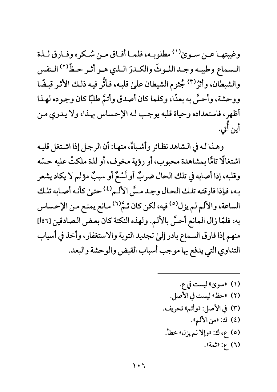 وهذا له في الشاهد نظائر وأشباهٌ، منها: أن الرجل إذا اشتغل قلبه اشتغالًا تامًّا بمشاهدة محبوب، أو رؤية مخوف، أو لذة ملكتْ عليه حسّه وقلبه، إذا أصابه في تلك الحال ضربٌ أو لَسْعٌ أو سببٌ مؤلم لا يكاد يشعر به، فإذا فارقته تلك الحال وجد مسَّ الألم (¬٤) حتى كأنه أصابه تلك الساعة، والألم لم يزل (¬٥) فيه، لكن كان ثمَّ (¬٦) مانع يمنع من الإحساس به، فلمّا زال المانع أحسَّ بالألم. ولهذه النكتة كان بعض الصادقين [٤٦ أ] منهم إذا فارق السماع بادر إلى تجديد التوبة والاستغفار، وأخذ في أسباب التداوي التي يدفع بها موجب أسباب القبض والوحشة والبعد.