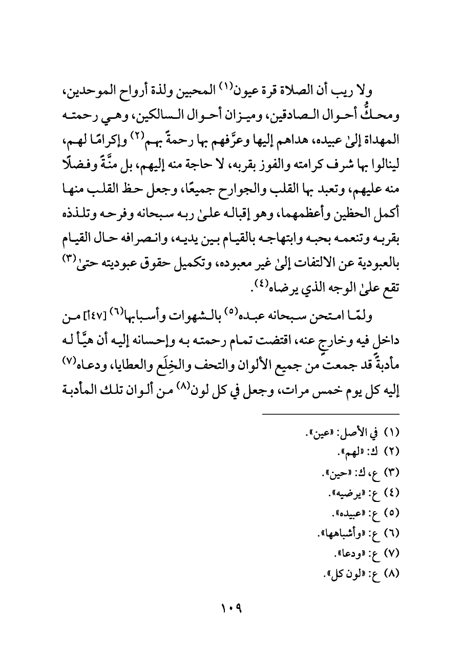 ولا ريب أن الصلاة قرة عيون (¬١) المحبين ولذة أرواح الموحدين، ومحكُّ أحوال الصادقين، وميزان أحوال السالكين، وهي رحمته المهداة إلى عبيده، هداهم إليها وعرَّفهم بها رحمةً بهم (¬٢) وإكرامًا لهم، لينالوا بها شرف كرامته والفوز بقربه، لا حاجة منه إليهم، بل منَّةً وفضلًا منه عليهم، وتعبد بها القلب والجوارح جميعًا، وجعل حظ القلب منها أكمل الحظين وأعظمهما، وهو إقباله على ربه سبحانه وفرحه وتلذذه بقربه وتنعمه بحبه وابتهاجه بالقيام بين يديه، وانصرافه حال القيام بالعبودية عن الالتفات إلى غير معبوده، وتكميل حقوق عبوديته حتى (¬٣) تقع على الوجه الذي يرضاه (¬٤).