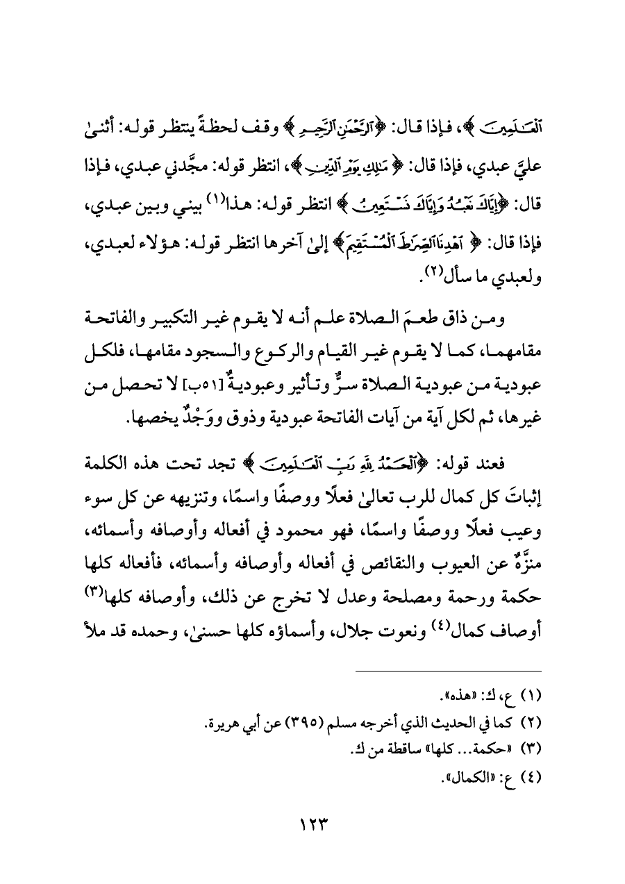 ومن ذاق طعمَ الصلاة علم أنه لا يقوم غير التكبير والفاتحة مقامهما، كما لا يقوم غير القيام والركوع والسجود مقامها، فلكل عبودية من عبودية الصلاة سرٌّ وتأثير وعبوديةٌ [٥١ ب] لا تحصل من غيرها، ثم لكل آية من آيات الفاتحة عبودية وذوق ووَجْدٌ يخصها.