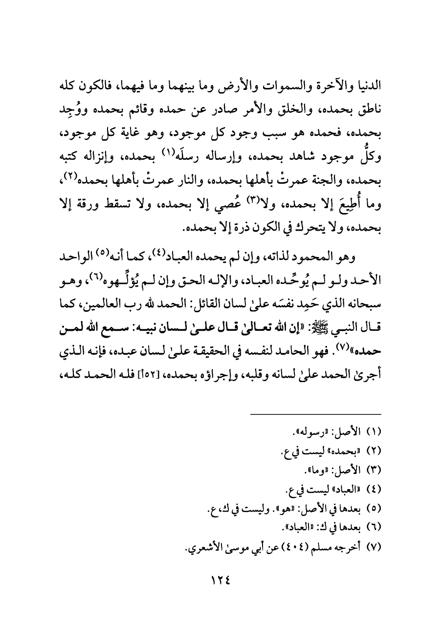 وهو المحمود لذاته، وإن لم يحمده العباد (¬٤)، كما أنه (¬٥) الواحد الأحد ولو لم يُوحِّده العباد، والإله الحق وإن لم يُؤلِّهوه (¬٦)، وهو سبحانه الذي حَمِد نفسَه على لسان القائل: الحمد لله رب العالمين، كما قال النبي - صلى الله عليه وسلم -: "إن الله تعالى قال على لسان نبيه: سمع الله لمن حمده" (¬٧). فهو الحامد لنفسه في الحقيقة على لسان عبده، فإنه الذي أجرى الحمد على لسانه وقلبه، وإجراؤه بحمده، [٥٢ أ] فله الحمد كله،