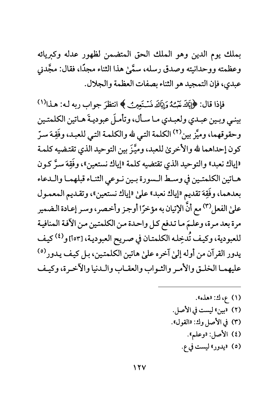 فإذا قال: {إِيَّاكَ نَعْبُدُ وَإِيَّاكَ نَسْتَعِينُ} انتظرَ جواب ربه له: هذا (¬١) بيني وبين عبدي ولعبدي ما سأل، وتأملَ عبوديةَ هاتين الكلمتين وحقوقهما، وميَّز بين (¬٢) الكلمة التي لله والكلمة التي للعبد، وفَقِهَ سرّ كون إحداهما لله والأخرى للعبد، وميَّزَ بين التوحيد الذي تقتضيه كلمة "إياك نعبد" والتوحيد الذي تقتضيه كلمة "إياك نستعين"، وفَقِهَ سرَّ كون هاتين الكلمتين في وسط السورة بين نوعي الثناء قبلهما والدعاء بعدهما، وفَقِهَ تقديم "إياك نعبد" على "إياك نستعين"، وتقديم المعمول على الفعل (¬٣) مع أنَّ الإتيان به مؤخرًا أوجز وأخصر، وسر إعادة الضمير مرة بعد مرة، وعلمَ ما تدفع كل واحدة من الكلمتين من الآفة المنافية للعبودية، وكيف تُدخِله الكلمتان في صريح العبودية، [٥٣ أ] و (¬٤) كيف يدور القرآن من أوله إلى آخره على هاتين الكلمتين، بل كيف يدور (¬٥) عليهما الخلق والأمر والثواب والعقاب والدنيا والآخرة، وكيف
