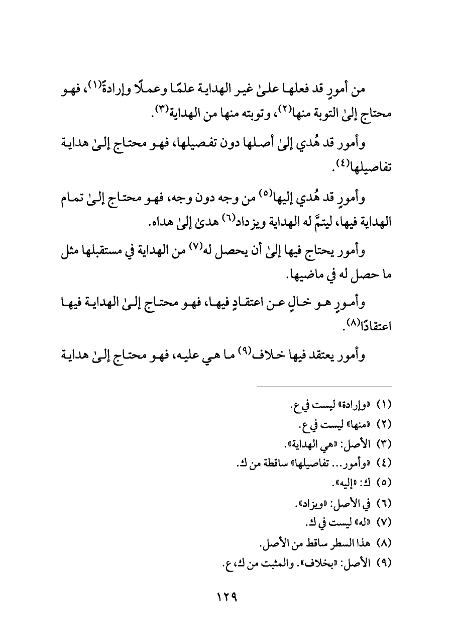 وأمور يعتقد فيها خلاف (¬٩) ما هي عليه، فهو محتاج إلى هداية