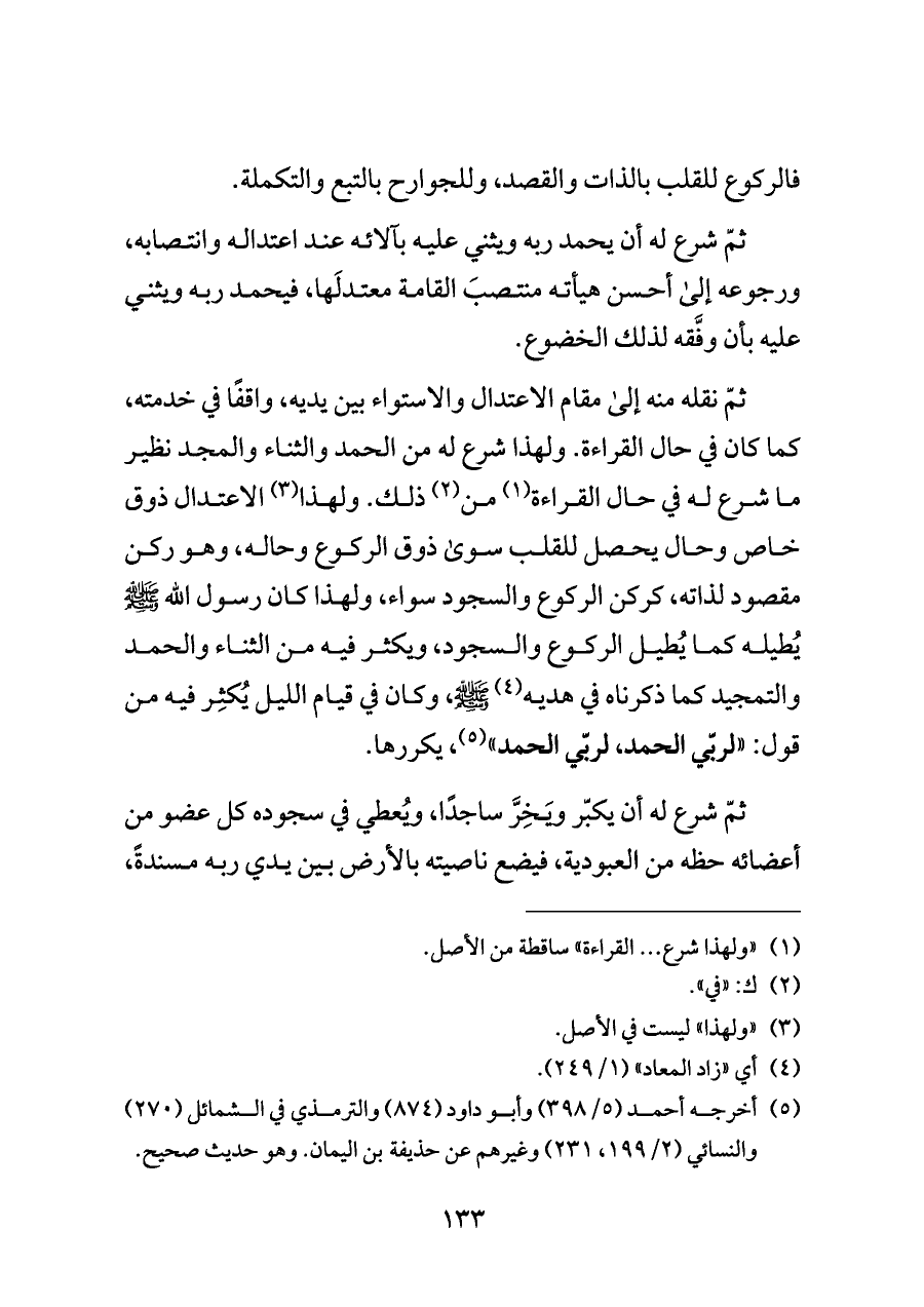 ثمّ نقله منه إلى مقام الاعتدال والاستواء بين يديه، واقفًا في خدمته، كما كان في حال القراءة. ولهذا شرع له من الحمد والثناء والمجد نظير ما شرع له في حال القراءة (¬١) من (¬٢) ذلك. ولهذا (¬٣) الاعتدال ذوق خاص وحال يحصل للقلب سوى ذوق الركوع وحاله، وهو ركن مقصود لذاته، كركن الركوع والسجود سواء، ولهذا كان رسول الله - صلى الله عليه وسلم - يُطيله كما يُطيل الركوع والسجود، ويكثر فيه من الثناء والحمد والتمجيد كما ذكرناه في هديه (¬٤) - صلى الله عليه وسلم -، وكان في قيام الليل يُكثِر فيه من قول: "لربّي الحمد، لربّي الحمد" (¬٥)، يكررها.