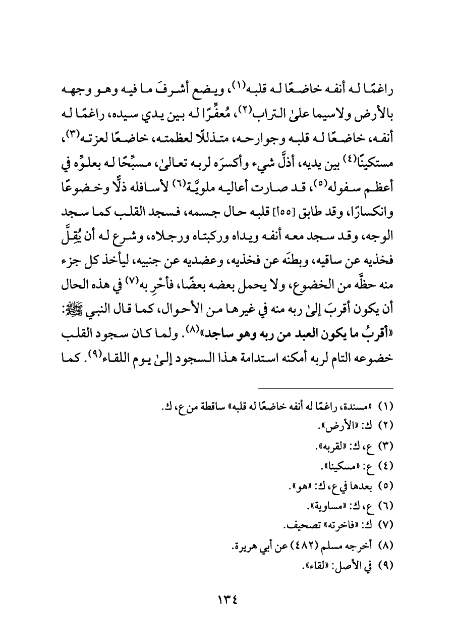راغمًا له أنفه خاضعًا له قلبه (¬١)، ويضع أشرفَ ما فيه وهو وجهه بالأرض ولاسيما على التراب (¬٢)، مُعفِّرًا له بين يدي سيده، راغمًا له أنفه، خاضعًا له قلبه وجوارحه، متذللًا لعظمته، خاضعًا لعزته (¬٣)، مستكينًا (¬٤) بين يديه، أذلَّ شيء وأكسرَه لربه تعالى، مسبِّحًا له بعلوِّه في أعظم سفوله (¬٥)، قد صارت أعاليه ملويَّة (¬٦) لأسافله ذلًّا وخضوعًا وانكسارًا، وقد طابق [٥٥ أ] قلبه حال جسمه، فسجد القلب كما سجد الوجه، وقد سجد معه أنفه ويداه وركبتاه ورجلاه، وشرع له أن يُقِلَّ فخذيه عن ساقيه، وبطنَه عن فخذيه، وعضديه عن جنبيه، ليأخذ كل جزء منه حظَّه من الخضوع، ولا يحمل بعضه بعضًا، فأحْرِ به (¬٧) في هذه الحال أن يكون أقربَ إلى ربه منه في غيرها من الأحوال، كما قال النبي - صلى الله عليه وسلم -: "أقربُ ما يكون العبد من ربه وهو ساجد" (¬٨). ولما كان سجود القلب خضوعه التام لربه أمكنه استدامة هذا السجود إلى يوم اللقاء (¬٩). كما