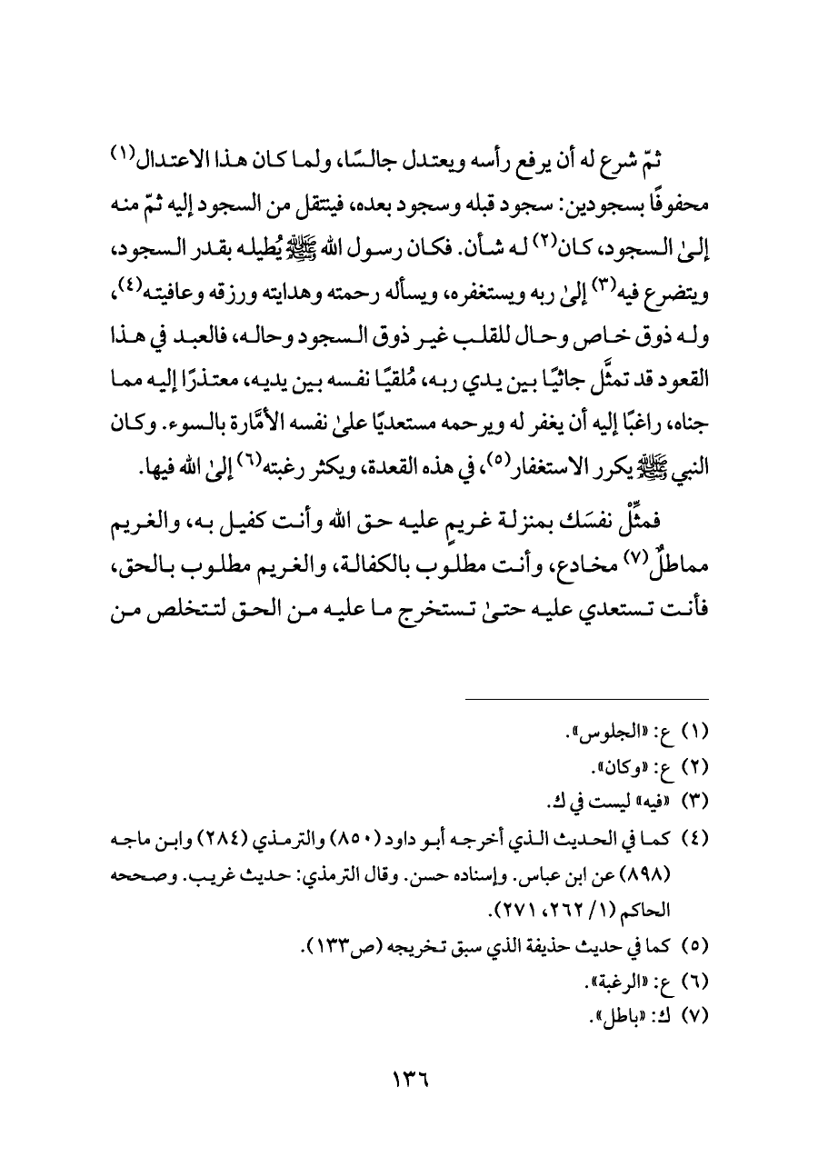 ثمّ شرع له أن يرفع رأسه ويعتدل جالسًا، ولما كان هذا الاعتدال (¬١) محفوفًا بسجودين: سجود قبله وسجود بعده، فينتقل من السجود إليه ثمّ منه إلى السجود، كان (¬٢) له شأن. فكان رسول الله - صلى الله عليه وسلم - يُطيله بقدر السجود، ويتضرع فيه (¬٣) إلى ربه ويستغفره، ويسأله رحمته وهدايته ورزقه وعافيته (¬٤)، وله ذوق خاص وحال للقلب غير ذوق السجود وحاله، فالعبد في هذا القعود قد تمثَّل جاثيًا بين يدي ربه، مُلقيًا نفسه بين يديه، معتذرًا إليه مما جناه، راغبًا إليه أن يغفر له ويرحمه مستعديًا على نفسه الأمَّارة بالسوء. وكان النبي - صلى الله عليه وسلم - يكرر الاستغفار (¬٥)، في هذه القعدة، ويكثر رغبته (¬٦) إلى الله فيها.