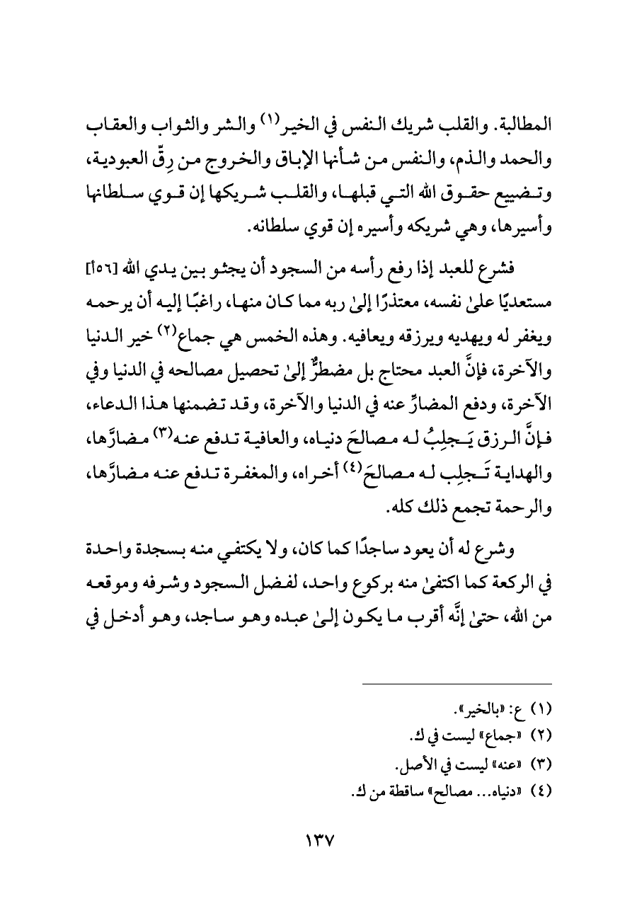 فشرع للعبد إذا رفع رأسه من السجود أن يجثو بين يدي الله [٥٦ أ] مستعديًا على نفسه، معتذرًا إلى ربه مما كان منها، راغبًا إليه أن يرحمه ويغفر له ويهديه ويرزقه ويعافيه. وهذه الخمس هي جماع (¬٢) خير الدنيا والآخرة، فإنَّ العبد محتاج بل مضطرٌّ إلى تحصيل مصالحه في الدنيا وفي الآخرة، ودفع المضارِّ عنه في الدنيا والآخرة، وقد تضمنها هذا الدعاء، فإنَّ الرزق يَجلِبُ له مصالحَ دنياه، والعافية تدفع عنه (¬٣) مضارَّها، والهداية تَجلِب له مصالحَ (¬٤) أخراه، والمغفرة تدفع عنه مضارَّها، والرحمة تجمع ذلك كله.